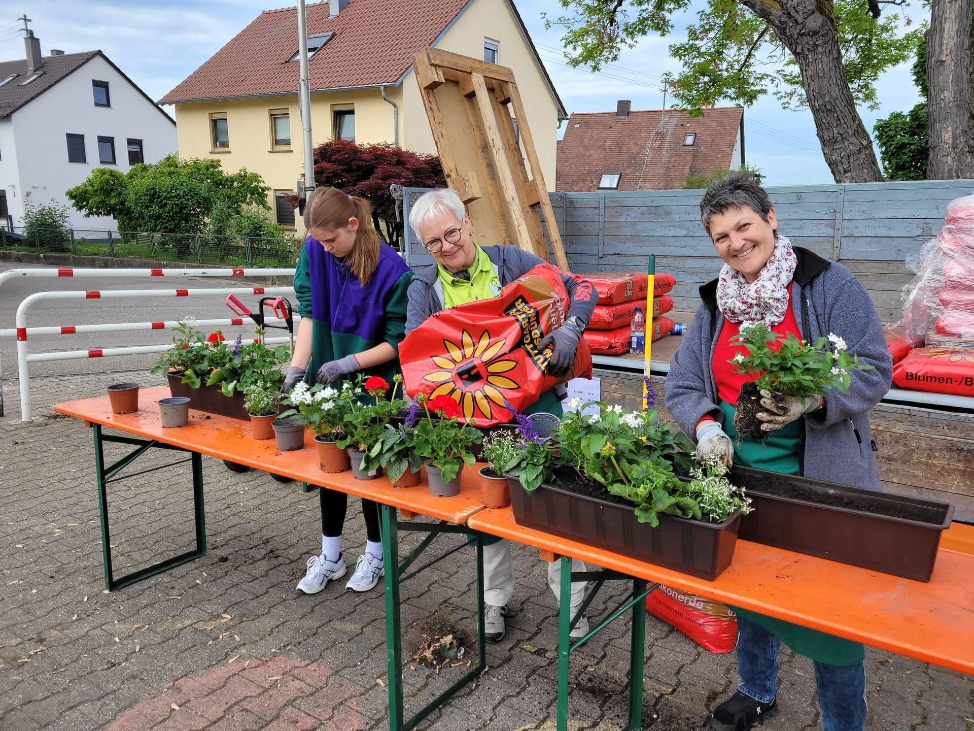 Danach strömten die Besucher kontinuierlich herbei, um sich das große Sortiment anzuschauen und um dann zu entscheiden, wie sie ihre Balkonkästen, Schalen und Tröge bepflanzen wollen. Viele nahmen die Unterstützung der anwesenden Vereinsmitglieder in Anspruch, die mit Rat und Tat den Besuchern zur Seite standen. Eine große Anzahl von Besuchern nahm auch das Angebot, ihre Kästen gleich vor Ort bepflanzen zu lassen, sehr gerne an.