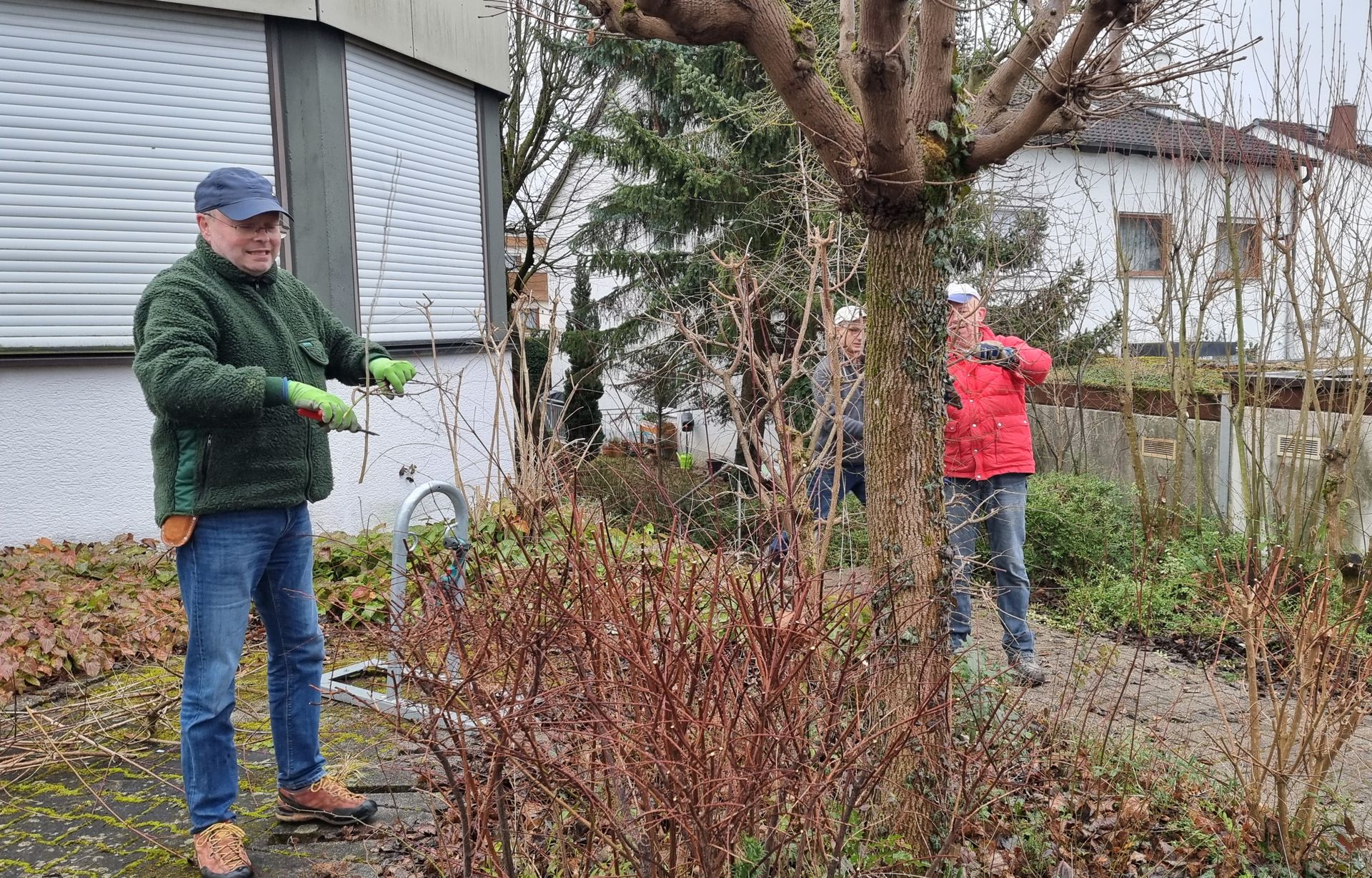 Es ist ja schon Tradition geworden, dass wir am Tag unseres 1. Schnittkurses im Jahr am Vormittag die Bäume und Sträucher beim ev. Gemeindehaus in Hochberg schneiden und in Form bringen.