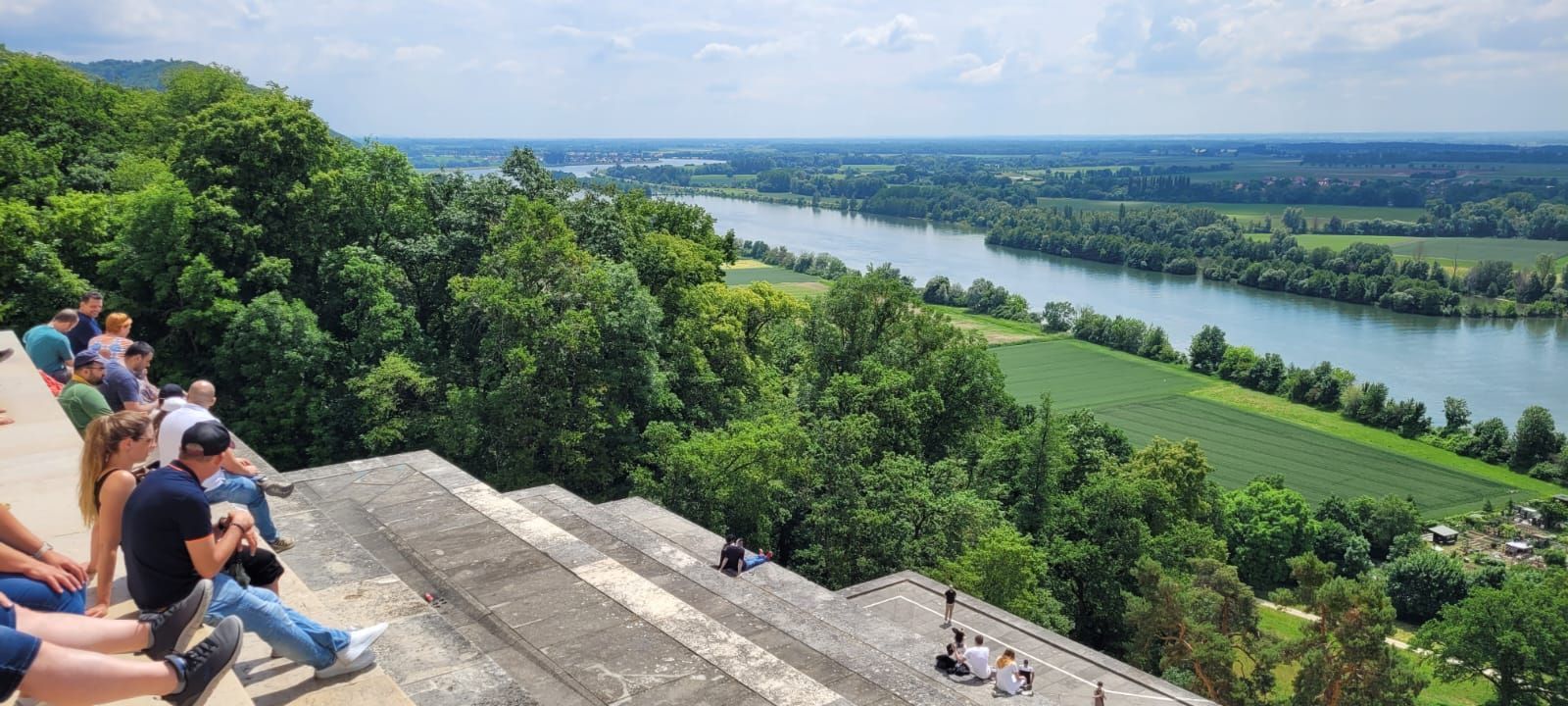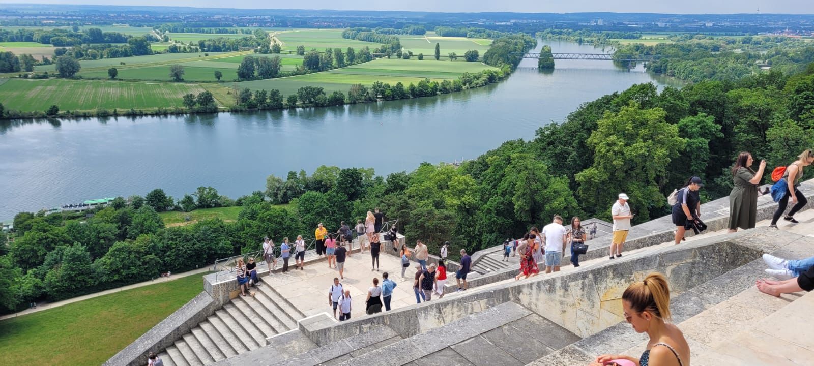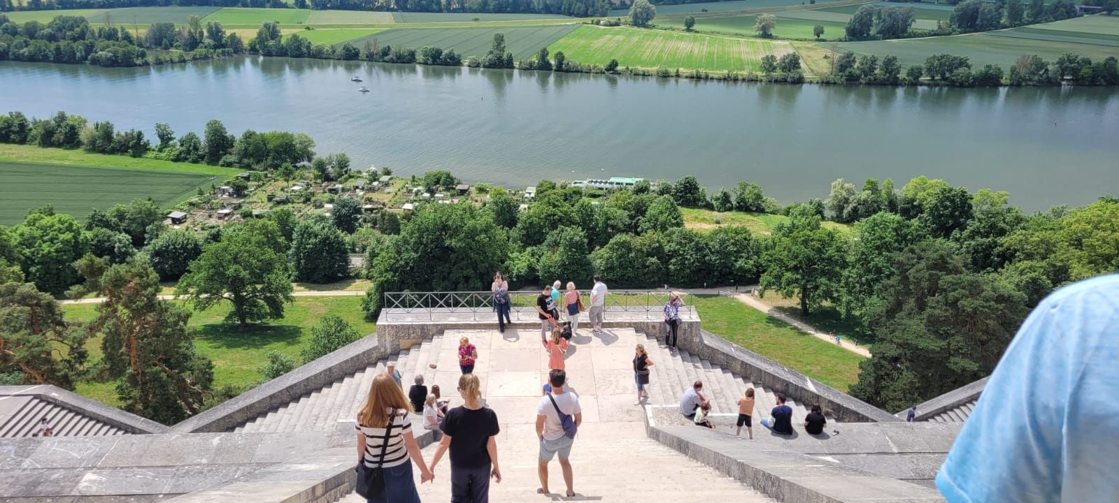 Ein weiterer Besichtigungspunkt am 11.6. war die Befreiungshalle über Kehlheim, gigantische Maße, hoch über der Donau und mit einem tollen Ausblick auf den Donaudurchbruch. Es war ein kleiner Fußweg bis dorthin. Diejenigen, die nicht gut zu Fuß waren, setzen sich unter einen der schattigen Bäume auf Bänke, der andere Teil ging die 84 Außenstufen hoch bis zur Innenbesichtigung der Halle. Eine nächste Gruppe schaffte auch die restlichen 165 Stufen bis zur obersten Galerie und konnte einen weiten Rundblick über die Umgebung genießen.