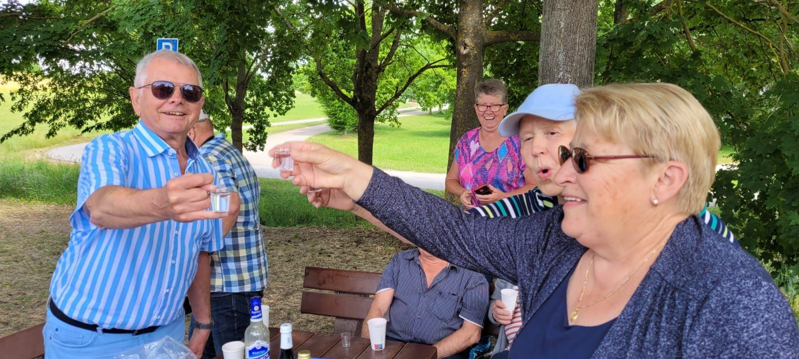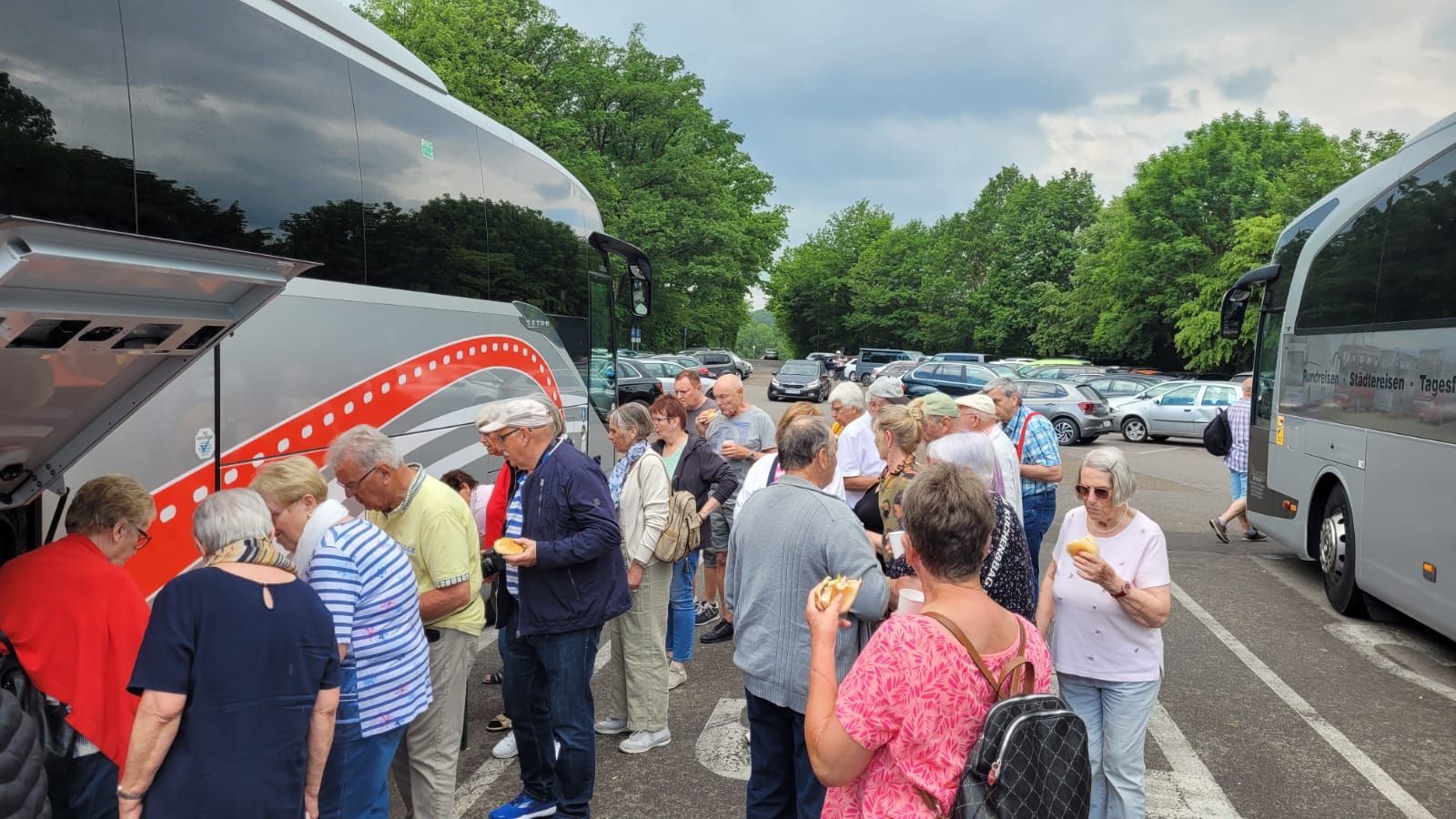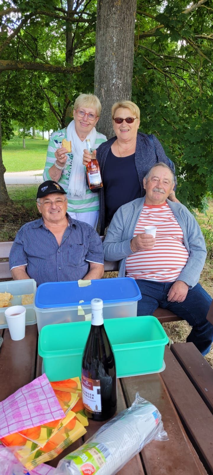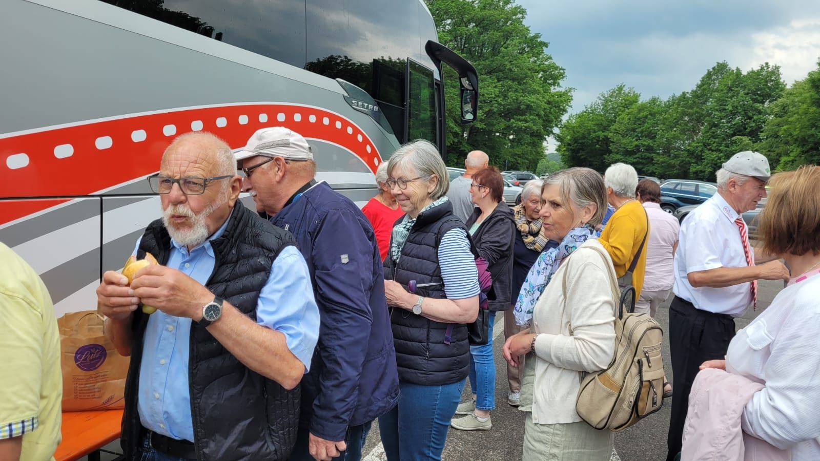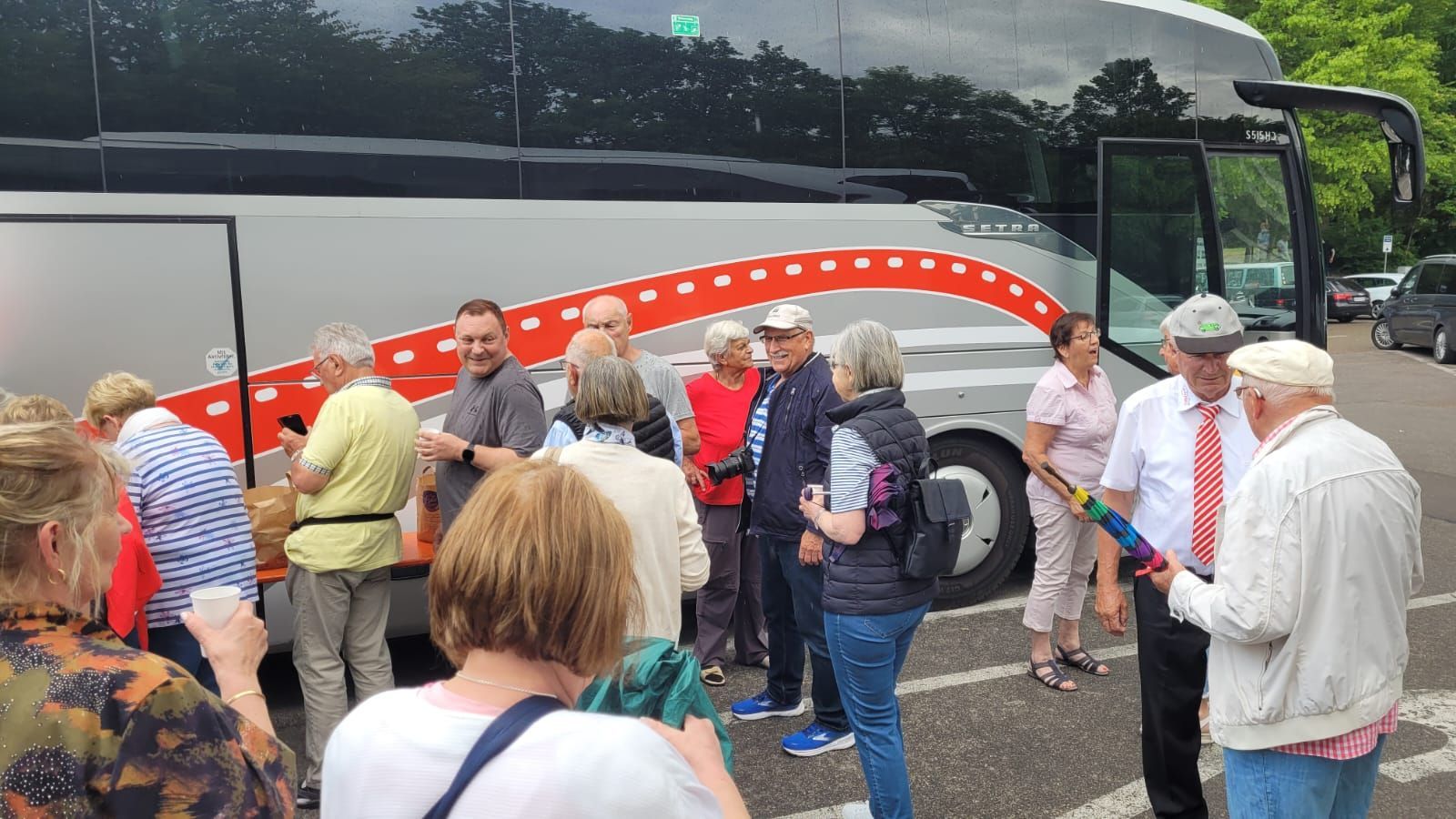 Pünktlich um 7 Uhr starteten wir am 10.6.2023 zu unserer Tour und durften dann gleich während der Kaffeepause das Glas zu Ehren eines Ausschussmitglieds erheben, der an diesem Tag Geburtstag hatte. Eine Familie spendierte den Mohnkuchen, eine andere den Hefezopf und dazu gab es einen feinen Rosé Secco. So fängt eine Reise doch schon gut an.
