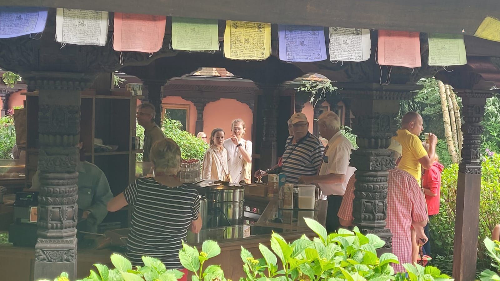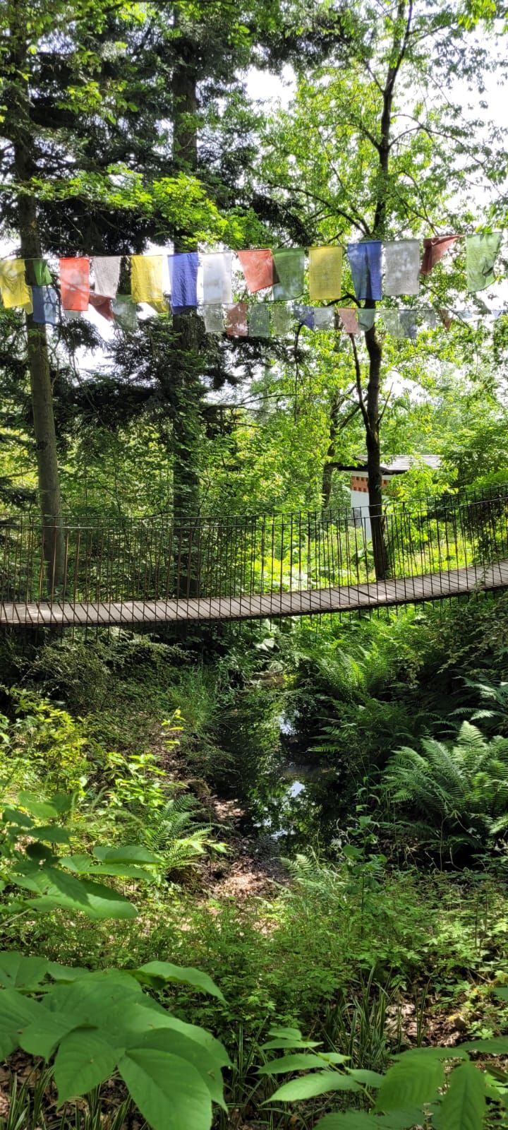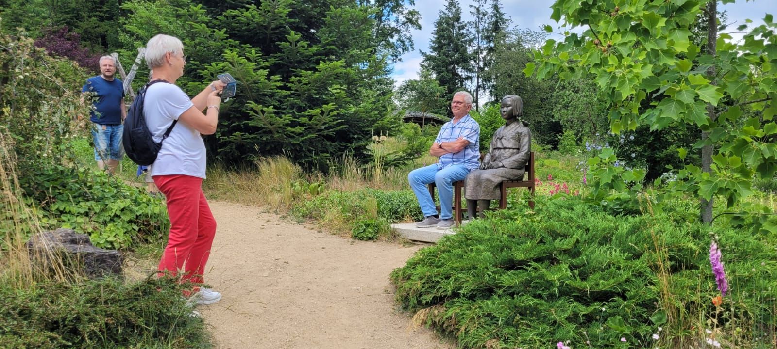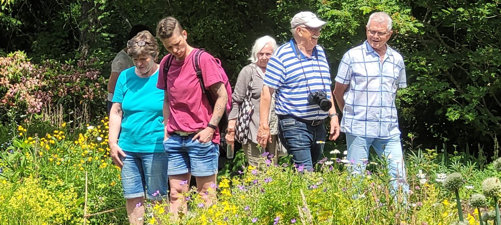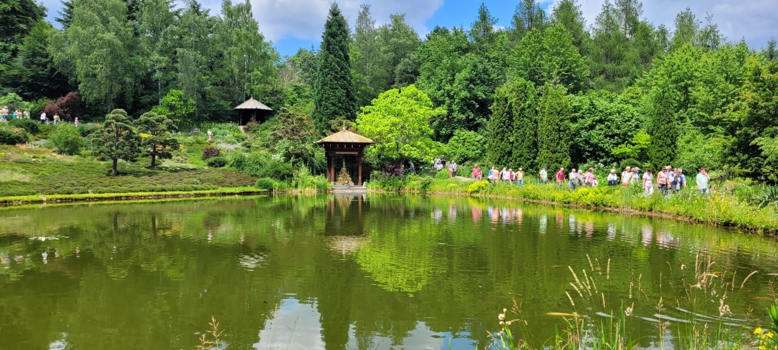 Gestärkt durch das herzhafte Vesper fuhren wir weiter zum Nepal Himalaya Park in Wiesent. Inmitten einer 9 ha großen Fläche steht der original nepalesische Tempel. Dies war Nepals Landesbeitrag zur Expo2000. Er war in Einzelteile zerlegt und seit 2003 in Wiesent wieder zu besuchen, eingebettet in einen spannenden und artenreichen Staudenpark, gepaart mit vielen asiatischen Kunstwerken. Sehr beeindruckend. Das Wetter wurde zunehmend sonniger und wärmer und der schattenreiche Park war ideal, um nach der Fahrt etwas Bewegung zu bekommen und die herrliche Pflanzenwelt zu bestaunen.