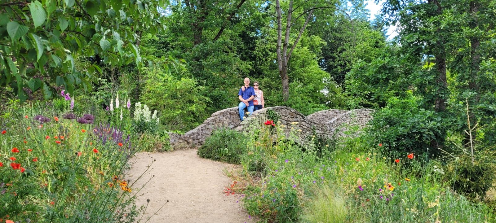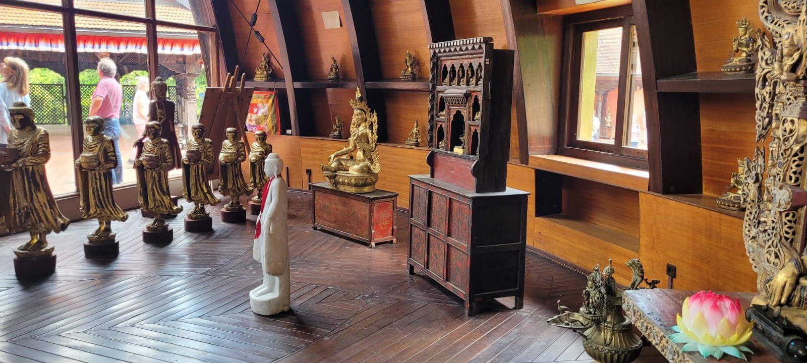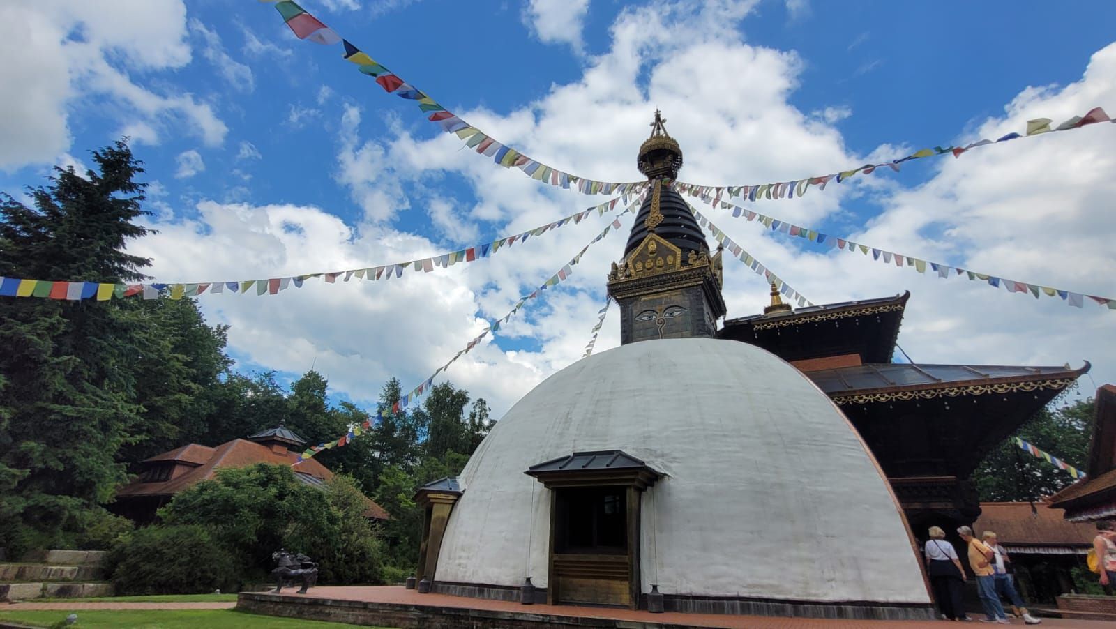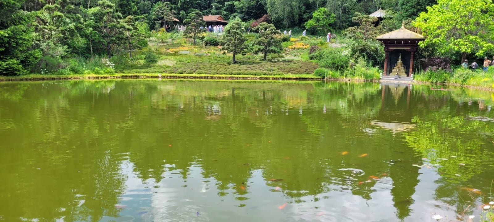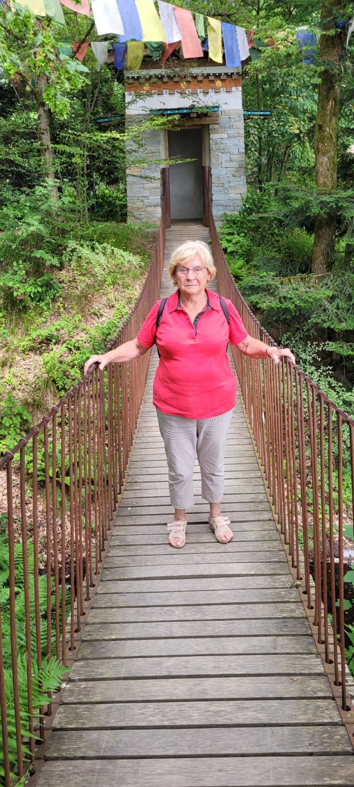 Gestärkt durch das herzhafte Vesper fuhren wir weiter zum Nepal Himalaya Park in Wiesent. Inmitten einer 9 ha großen Fläche steht der original nepalesische Tempel. Dies war Nepals Landesbeitrag zur Expo2000. Er war in Einzelteile zerlegt und seit 2003 in Wiesent wieder zu besuchen, eingebettet in einen spannenden und artenreichen Staudenpark, gepaart mit vielen asiatischen Kunstwerken. Sehr beeindruckend. Das Wetter wurde zunehmend sonniger und wärmer und der schattenreiche Park war ideal, um nach der Fahrt etwas Bewegung zu bekommen und die herrliche Pflanzenwelt zu bestaunen.