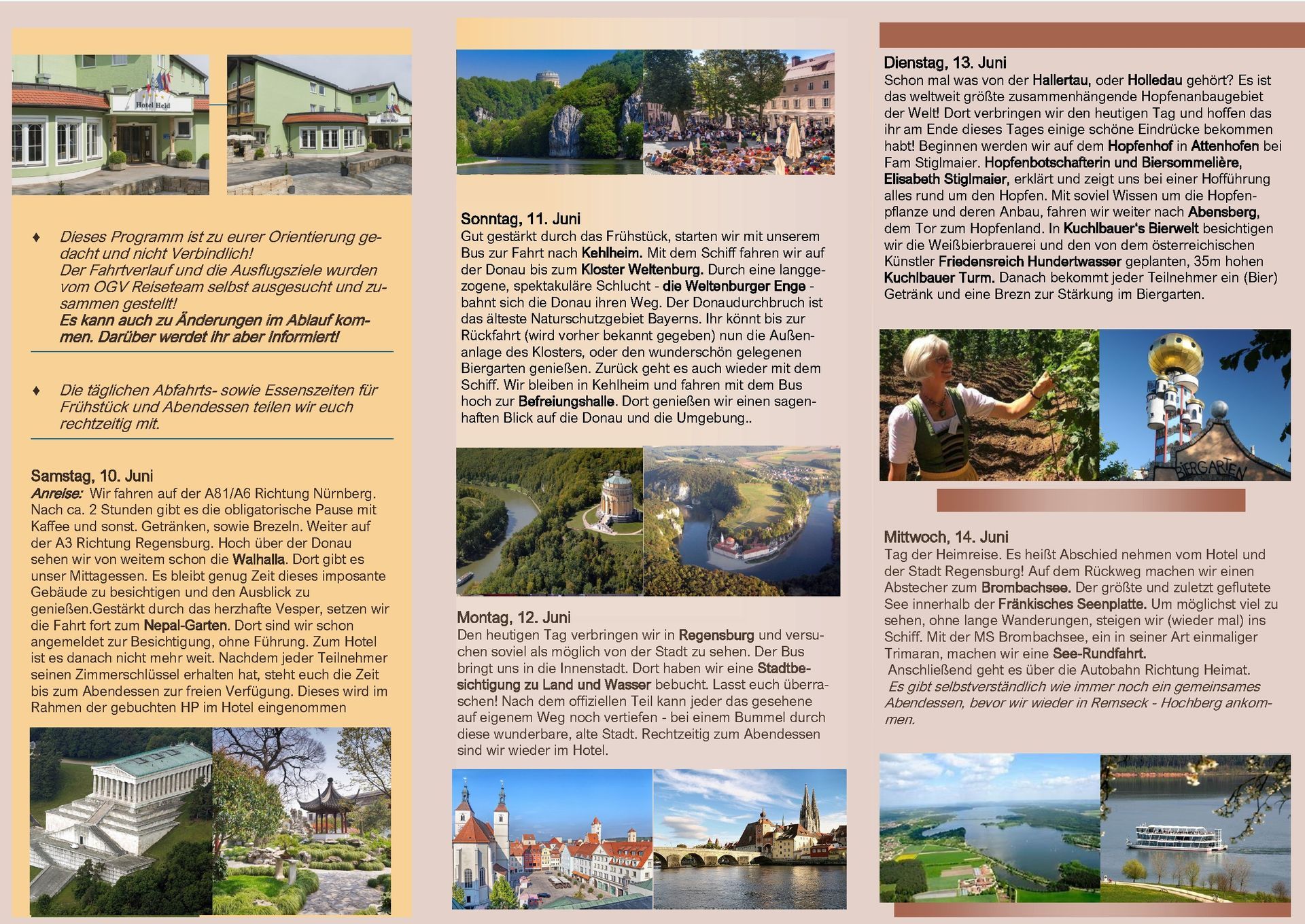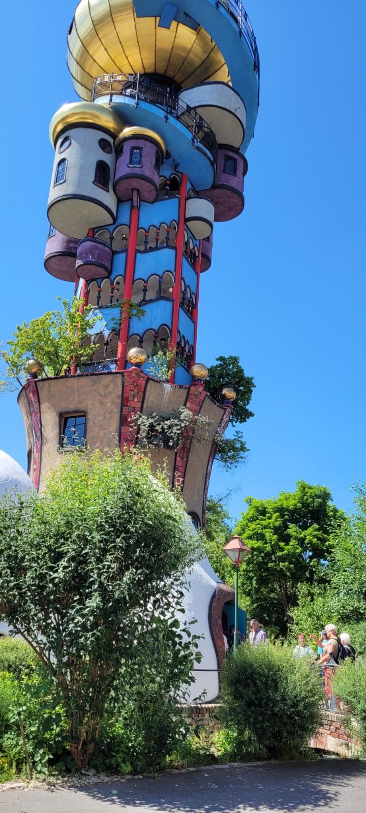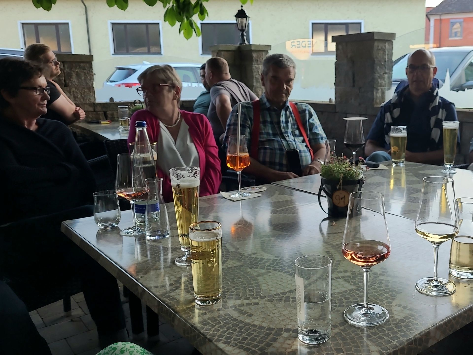 Um 14 Uhr waren wir dann zur Bierwelt-Führung in Abensberg angemeldet. Brautradition und Kunst in einer der ältesten Brauereien der Welt, in der Weißbierbrauerei 'Kuchlbauer'. Während der 90minütigen geführten Themenwelt-Führung durch Sudhaus, Gärkeller und Abfüllanlage gab es Infos zum Thema Bierbrauen. Im alten ehemaligen Braukeller eine visuell dargestellte (Märchen)Erzählung der 7 Weißbierzwerge. Nach der Verabschiedung konnte der Turm in Eigenregie besichtigt werden. Der Kuchlbauer Turm ist das Wahrzeichen von Kuchlbauer’s Bierwelt. Er ist ein Architekturprojekt des weltbekannten Künstlers Friedensreich Hundertwasser, geplant, geändert und bearbeitet von Architekt Peter Pelikan. Im Jahr 1999 entwarf Hundertwasser für den damaligen Brauereichef Leonhard Salleck einen 70 Meter hohen Turm, der in dieser Form nicht umgesetzt werden konnte. Doch nach Hundertwassers Tod diente der Entwurf als Inspiration für seinen langjährigen Freund und Mitarbeiter Peter Pelikan und dessen eigenständige Bearbeitung und Neuplanung des Turms (2007–2010). Der Keller des Turms beherbergt die weltgrößte Weißbierglas Sammlung. Die Erkundung des Turms war grandios - muss man selbst gesehen haben. Für jeden Teilnehmer war ein Gutschein für ein Bier nach Wahl und eine Brezel dabei. Diese nahmen wir im tollen Biergarten unter und um den Turm ein. Nach diesem erlebnisreichen Tag ging es zurück ins Hotel und zum Abendessen. Nach dem Essen - wie jeden Abend - lustiger geselliger Ausklang im Biergarten unter den Kastanien.