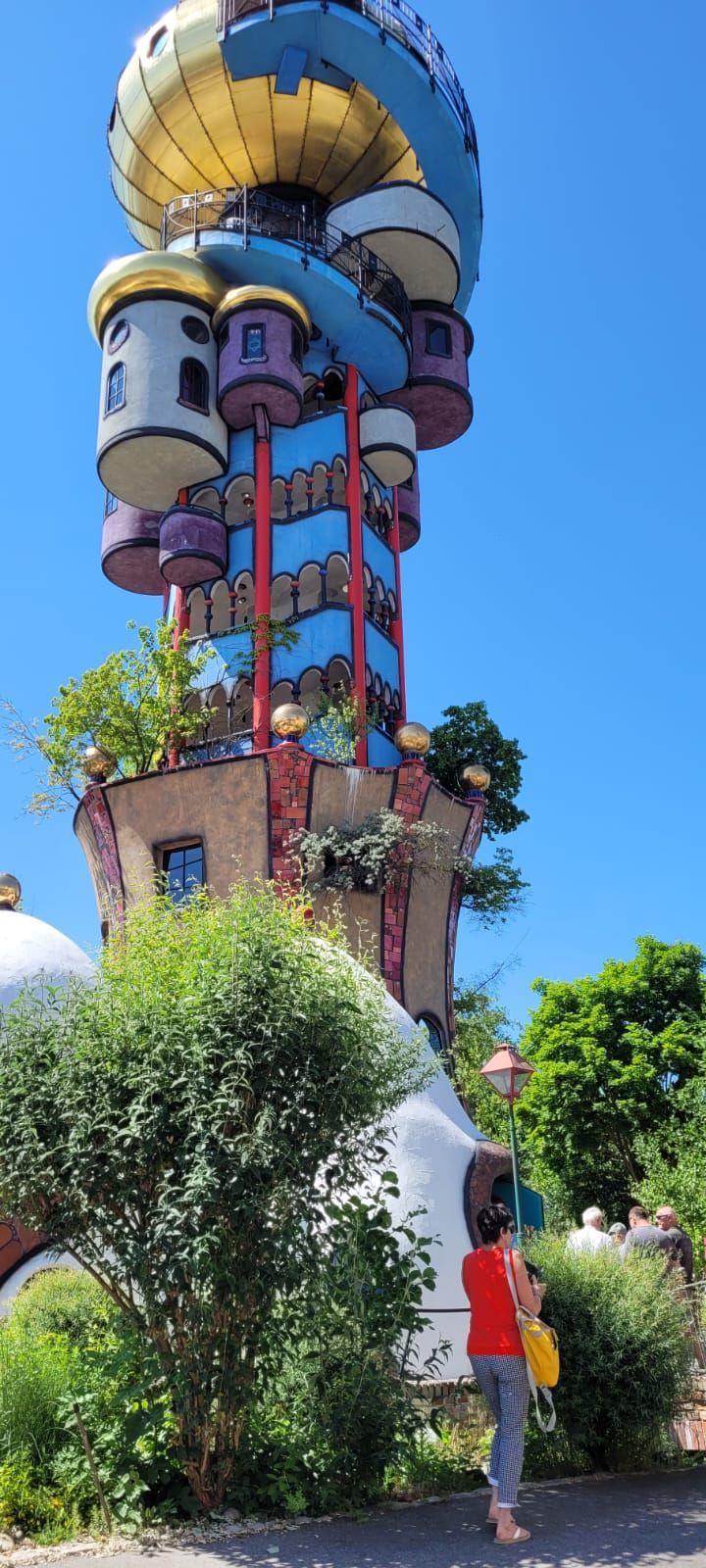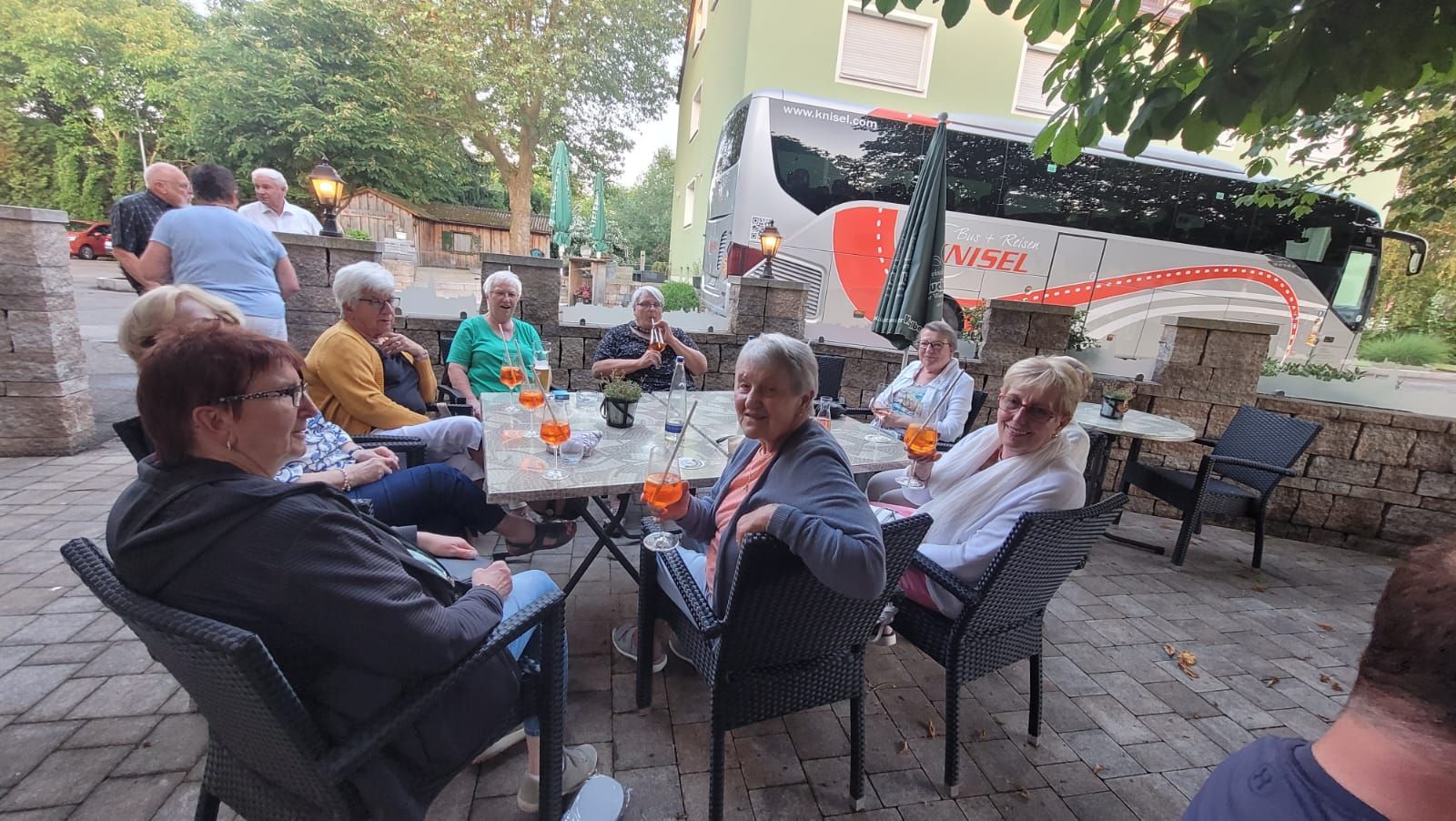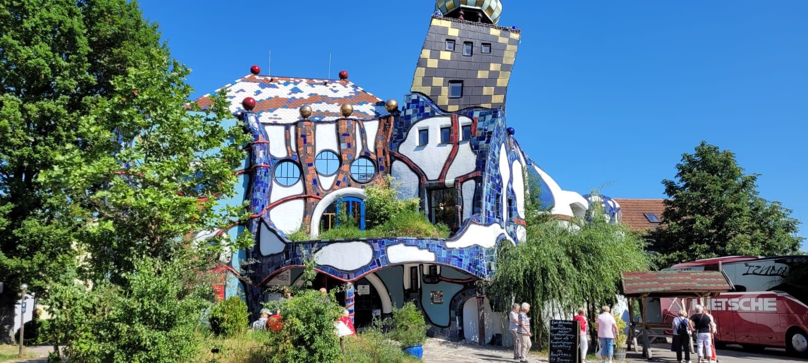 Um 14 Uhr waren wir dann zur Bierwelt-Führung in Abensberg angemeldet. Brautradition und Kunst in einer der ältesten Brauereien der Welt, in der Weißbierbrauerei 'Kuchlbauer'. Während der 90minütigen geführten Themenwelt-Führung durch Sudhaus, Gärkeller und Abfüllanlage gab es Infos zum Thema Bierbrauen. Im alten ehemaligen Braukeller eine visuell dargestellte (Märchen)Erzählung der 7 Weißbierzwerge. Nach der Verabschiedung konnte der Turm in Eigenregie besichtigt werden. Der Kuchlbauer Turm ist das Wahrzeichen von Kuchlbauer’s Bierwelt. Er ist ein Architekturprojekt des weltbekannten Künstlers Friedensreich Hundertwasser, geplant, geändert und bearbeitet von Architekt Peter Pelikan. Im Jahr 1999 entwarf Hundertwasser für den damaligen Brauereichef Leonhard Salleck einen 70 Meter hohen Turm, der in dieser Form nicht umgesetzt werden konnte. Doch nach Hundertwassers Tod diente der Entwurf als Inspiration für seinen langjährigen Freund und Mitarbeiter Peter Pelikan und dessen eigenständige Bearbeitung und Neuplanung des Turms (2007–2010). Der Keller des Turms beherbergt die weltgrößte Weißbierglas Sammlung. Die Erkundung des Turms war grandios - muss man selbst gesehen haben. Für jeden Teilnehmer war ein Gutschein für ein Bier nach Wahl und eine Brezel dabei. Diese nahmen wir im tollen Biergarten unter und um den Turm ein. Nach diesem erlebnisreichen Tag ging es zurück ins Hotel und zum Abendessen. Nach dem Essen - wie jeden Abend - lustiger geselliger Ausklang im Biergarten unter den Kastanien.