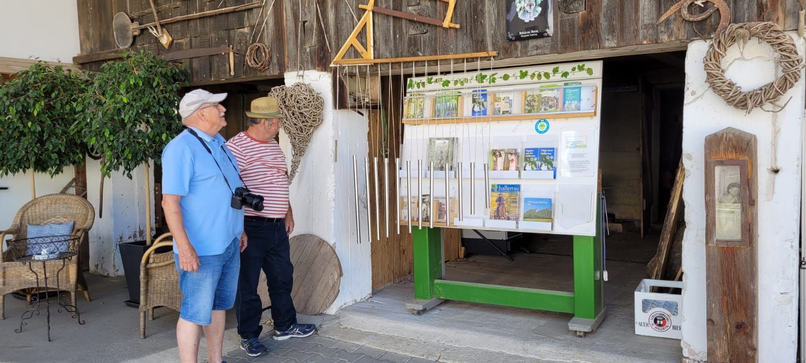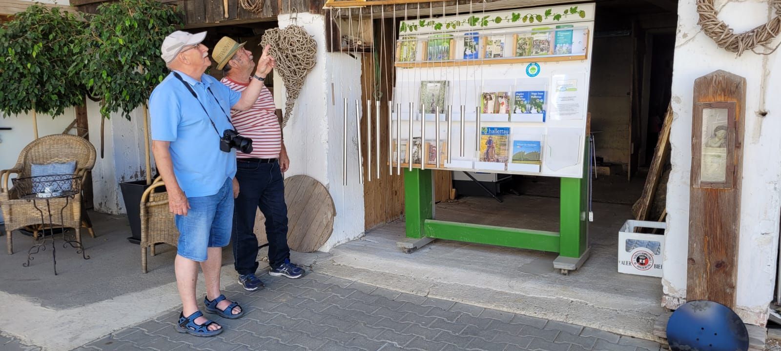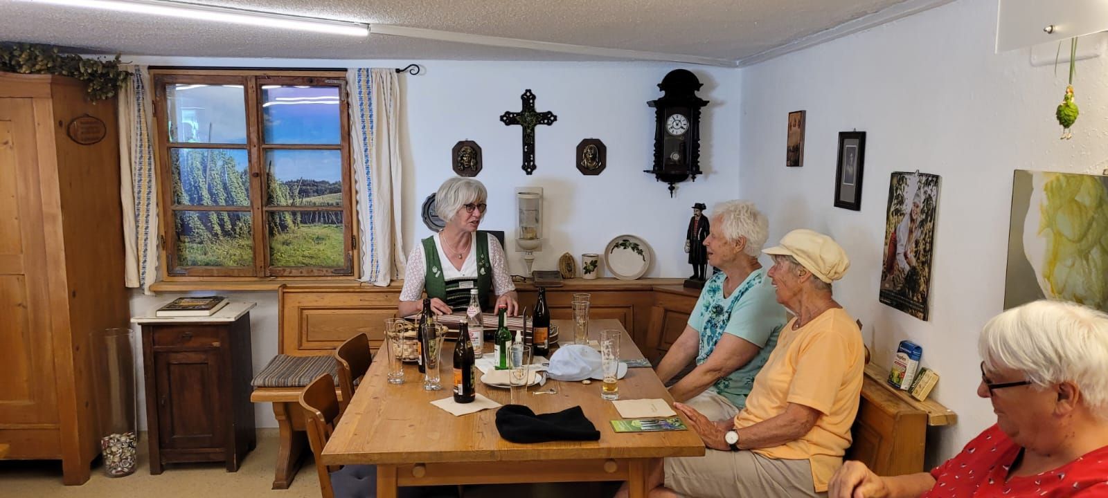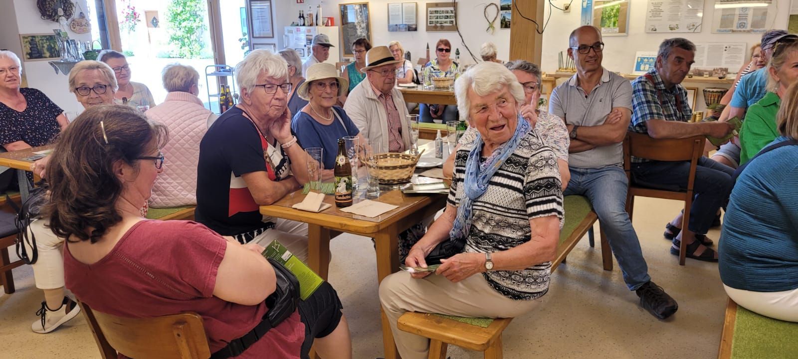 Am Dienstag, 13.6., ging es in die Holledau zum Hopfenhof der Fam Stiglmaier. Pünktlich um 10 Uhr erwartete uns Frau Stiglmaier zur Hopfen-Erlebnistour - vom „Hopfengarten zum köstlichen Bier“. Zuerst Begrüßung in der Scheune mit allerhand Wissenswertem - theoretisch und praktisch - über Hof, Familie, den Hopfen, Beginn des Anbaus überhaupt, Verwendung heute, u.v.m. Frau Stiglmaier war professionell ausgestattet mit Micro und so konnte wirklich jeder gut hören. Anschließend kurzer Fußweg zur örtlichen Kapelle. Dort erklärte sie allerhand zur Entstehung der Hopfenbauernhöfe. In der Kapelle nahmen wir alle Platz und hörten die Geschichte des Kirchleins, untermalt mit Bildern und zum Abschluss gemeinsames Singen. Danach ging es mit dem Bus auf das Hopfenfeld. Dort bekamen wir zur Erfrischung (es war wieder ein schöner warmer Tag) das fertige Ergebnis des Hopfens in Getränke Form, einmal als gebrautes Bier und einmal als Hopfenlimo! Köstlich! Wieder gab es viel zu hören und zu sehen bei Frau Stiglmaiers Vortrag. Wir saßen direkt bei den Hopfenpflanzen, die ihre endgültige Höhe noch nicht ganz erreicht hatten. Wieder zurück auf dem Hof, hieß es Platz nehmen in der Hopfen-ProBier-Stube. Dort gab es dann noch einige Erläuterungen und flüssigen Hopfen zum Testen. Zum Schluss spielte Frau Stiglmaier auf der Zither noch einige Lieder aus der Holledau und alle sangen gerne mit.