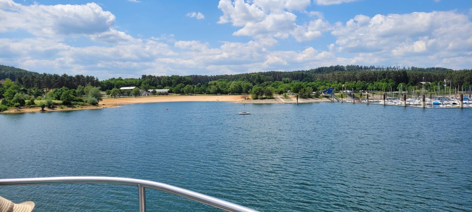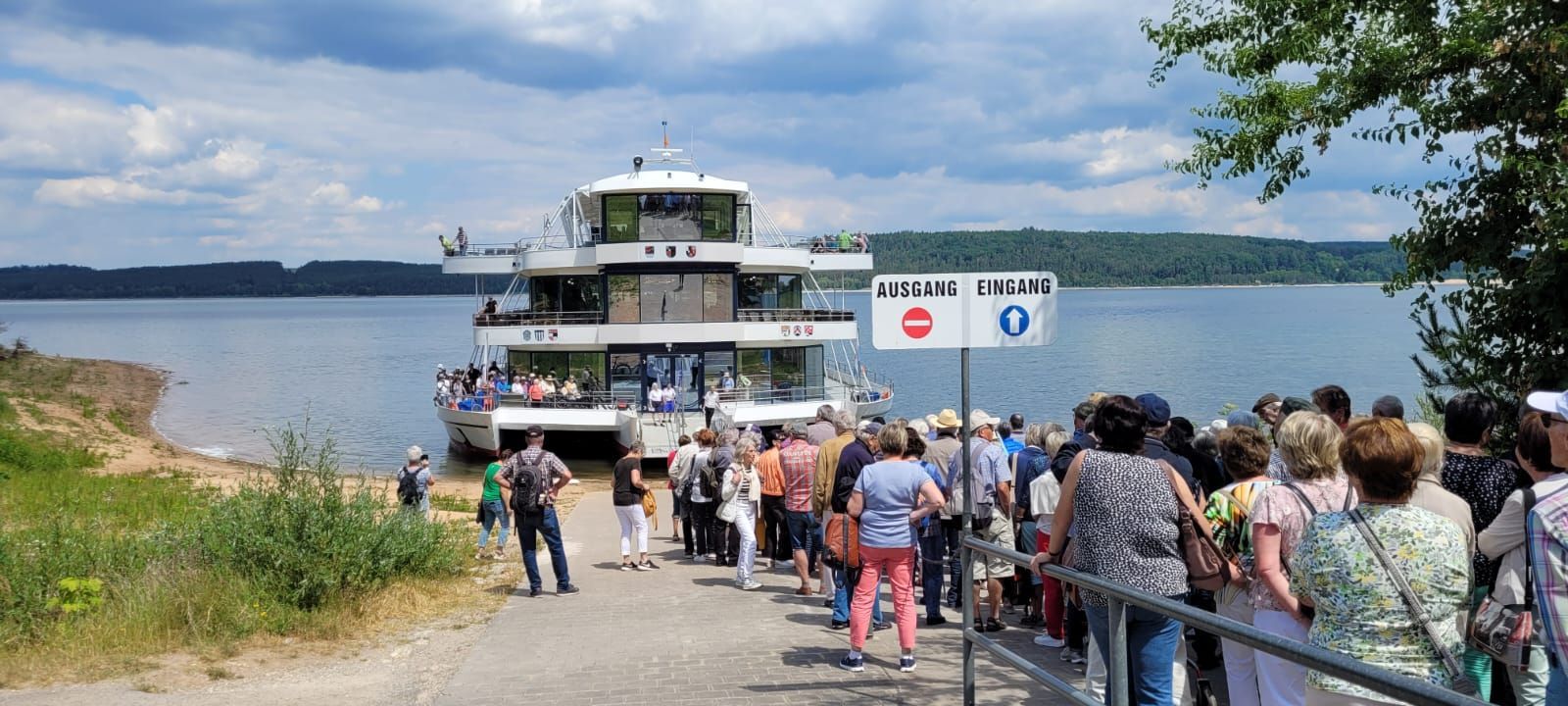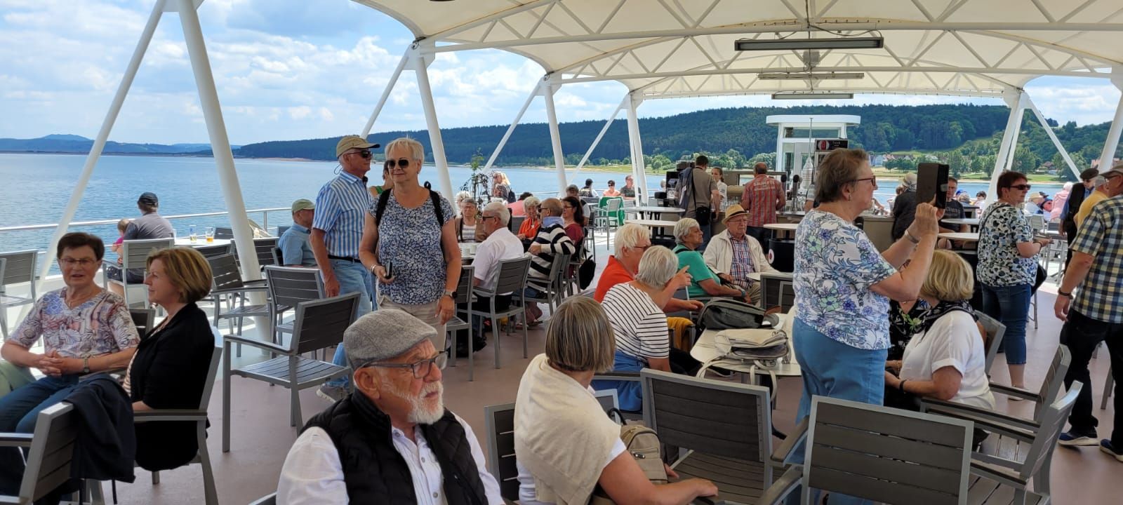 Mittwoch, 14. 6., Tag der Heimreise. Abfahrt war pünktlich um 9Uhr. Zuerst ging es zum großen Brombachsee, zum Ort Ramsberg. Von 12:30 bis 14 Uhr hatten wir eine Schifffahrt mit dem einmaligen Trimaran über den See gebucht. Wir waren früher als geplant dort, hatten einen tollen Parkplatz, ohne andere Busse und genügend Bänke und Tische zur Verfügung. Deshalb gab es gleich unser Resteessen! Gesellig und lustig verbrachten wir die Zeit bis zur Abfahrt unseres Schiffes. Ein Luxusschiff auf dem See! Viel Platz obwohl in der Zwischenzeit noch 2 Busse angekommen waren und die Passagiere auch mitfahren wollten. Es war im Gegensatz zu den vergangenen Tagen bewölkt und etwas kühler, was der Stimmung aber keinen Abbruch tat. Nach der Schifffahrt - wir haben vorher nicht alles geschafft - gab es die wirklichen Reste!!! Danach ging es zurück Richtung Heimat. Aber natürlich nicht bevor das traditionelle Abendessen eingenommen wurde. Dieses war bestellt in der Krone in Auenstein. Um 20 Uhr kamen wir dann sicher wieder in Hochberg an.