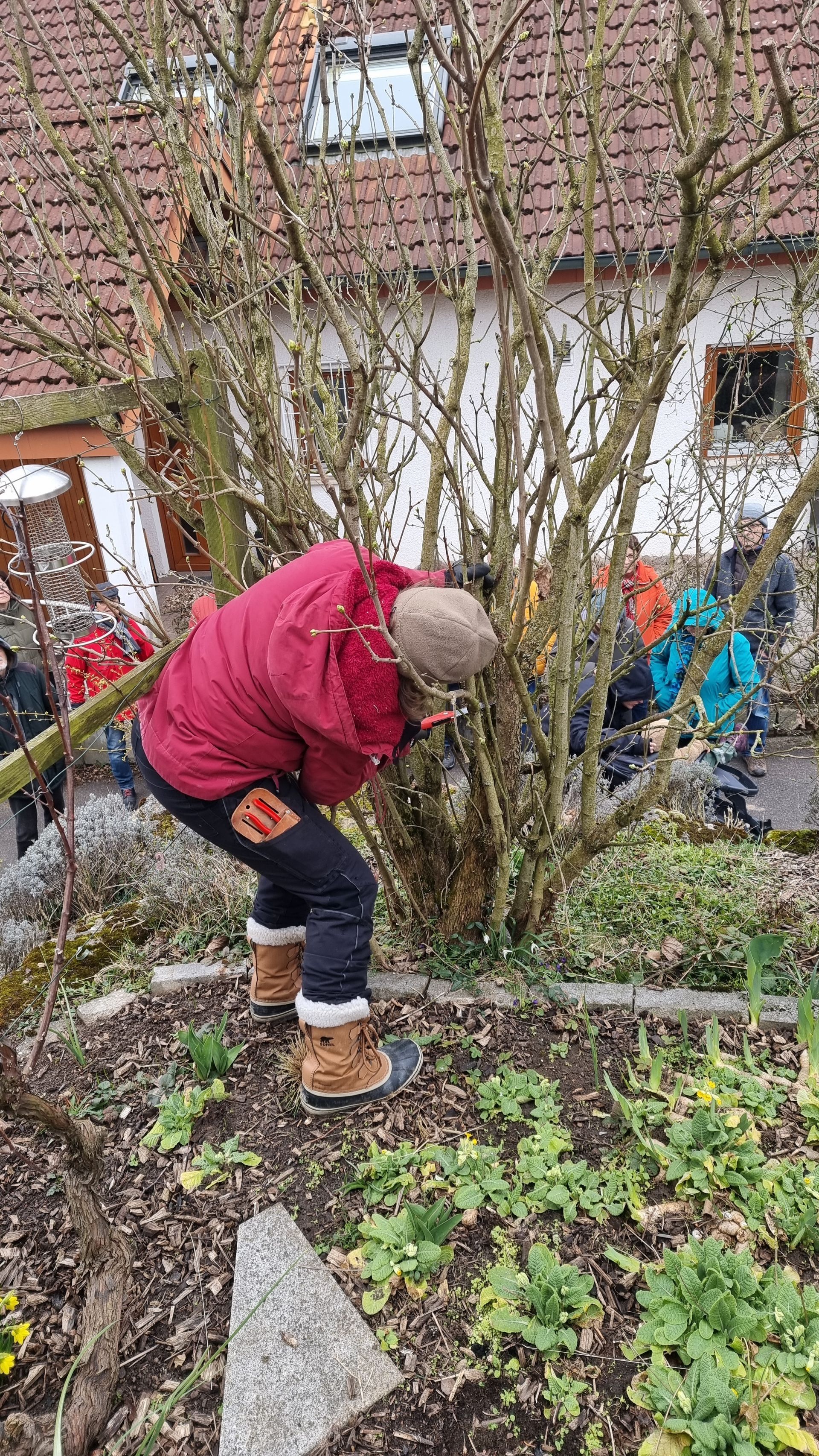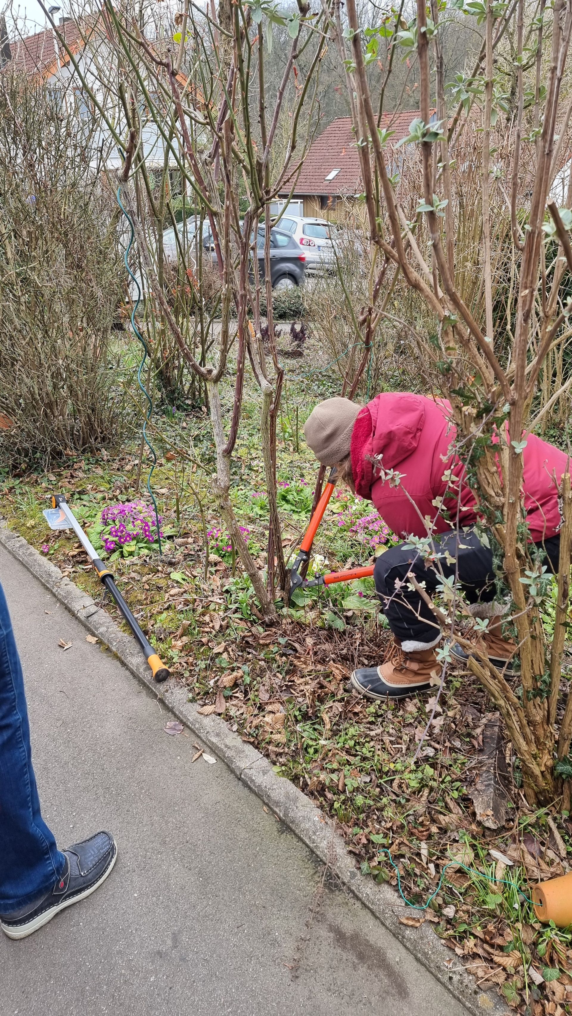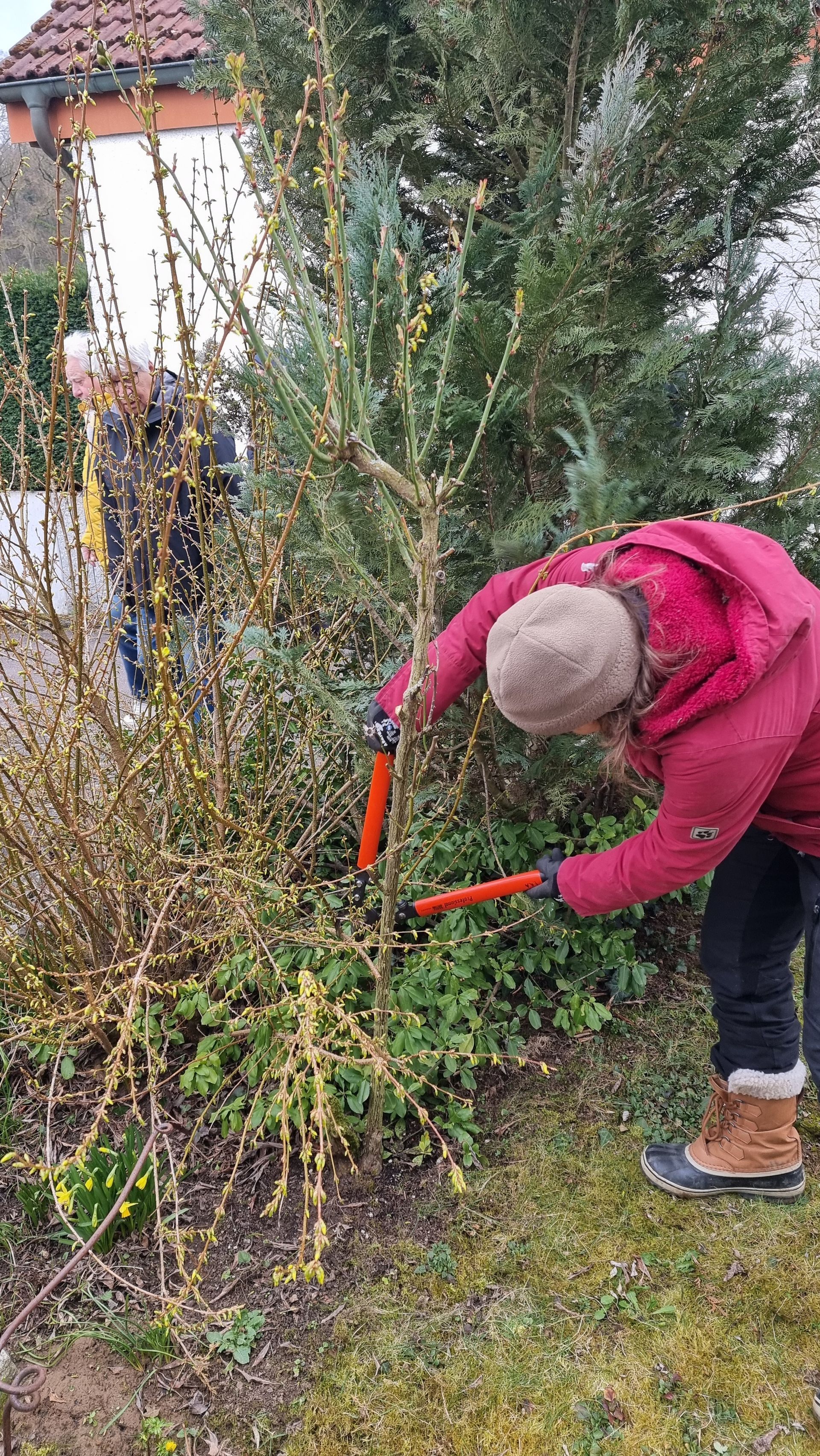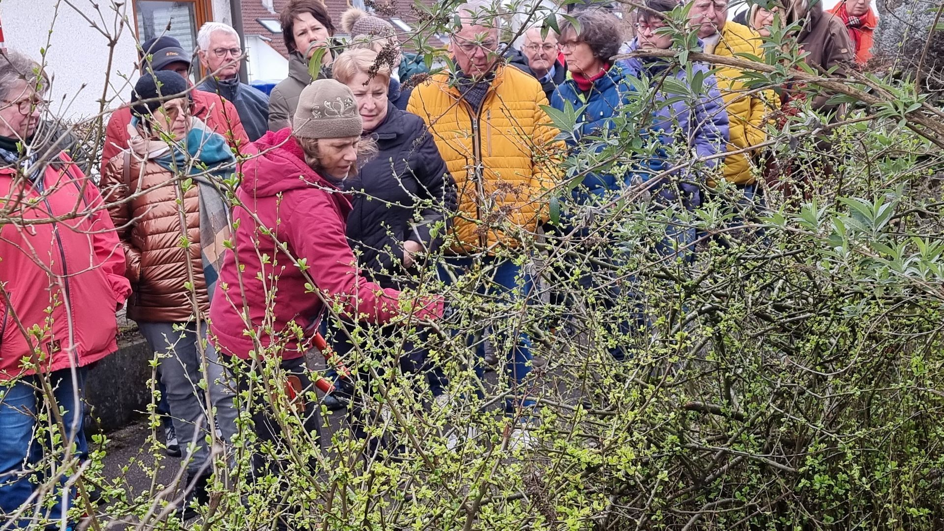 Sie fing bei einer Rose an, die sie beim letzten Mal sehr eingekürzt hatte und stellte fest, dass sie sich hervorragend entwickelt hatte. Ihre Schnittwerkzeuge kamen natürlich auch wieder bei dieser Rose zum Einsatz, so dass eine Nachbarin dazu animiert wurde, Fr. Rist auch ihre, schon lange nicht mehr geschnittene Rose, zu zeigen. Daraufhin begaben wir uns zum Nachbargrundstück und Frau Rist zeigte uns dort, wie man diese Rose wieder beleben konnte. Weiter ging es dann im Grundstück der Familie Riegraf, wo sie uns an diversen Gehölzen, u.a. Sommerflieder (Buddleja), Flieder (Syringa), Zierapfel, Forsythien, Weigelie, etc., zeigte, wie man die Sträucher wieder aktivieren und zu einer schönen Blüte bringen kann. Einige Sträucher wurden „nur“ ausgelichtet, bei anderen fiel der Schnitt radikaler aus 😉, d.h. es fiel natürlich auch dieses Mal wieder einiges an Schnittgut an.