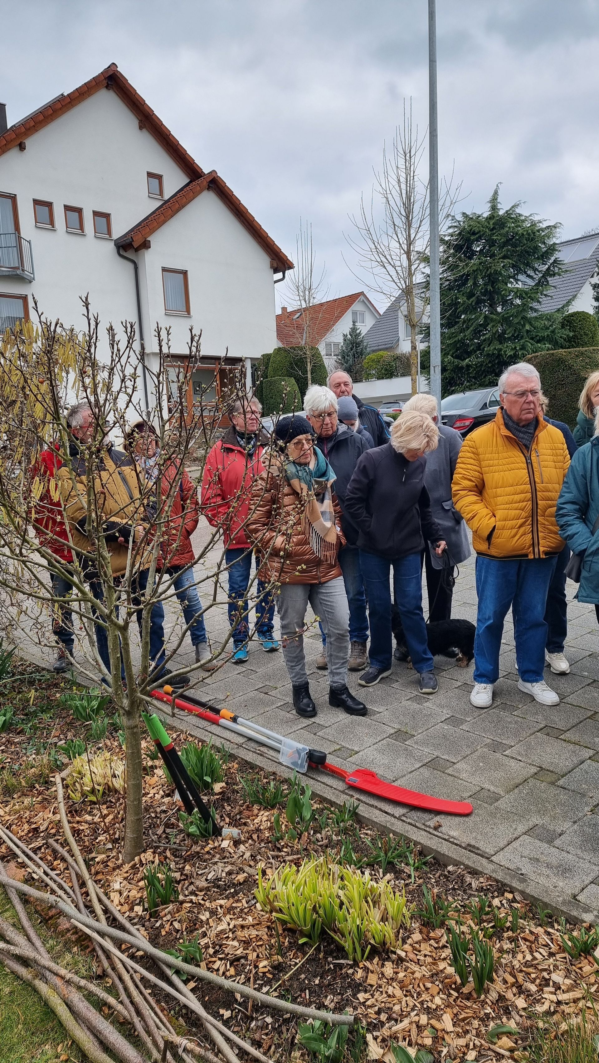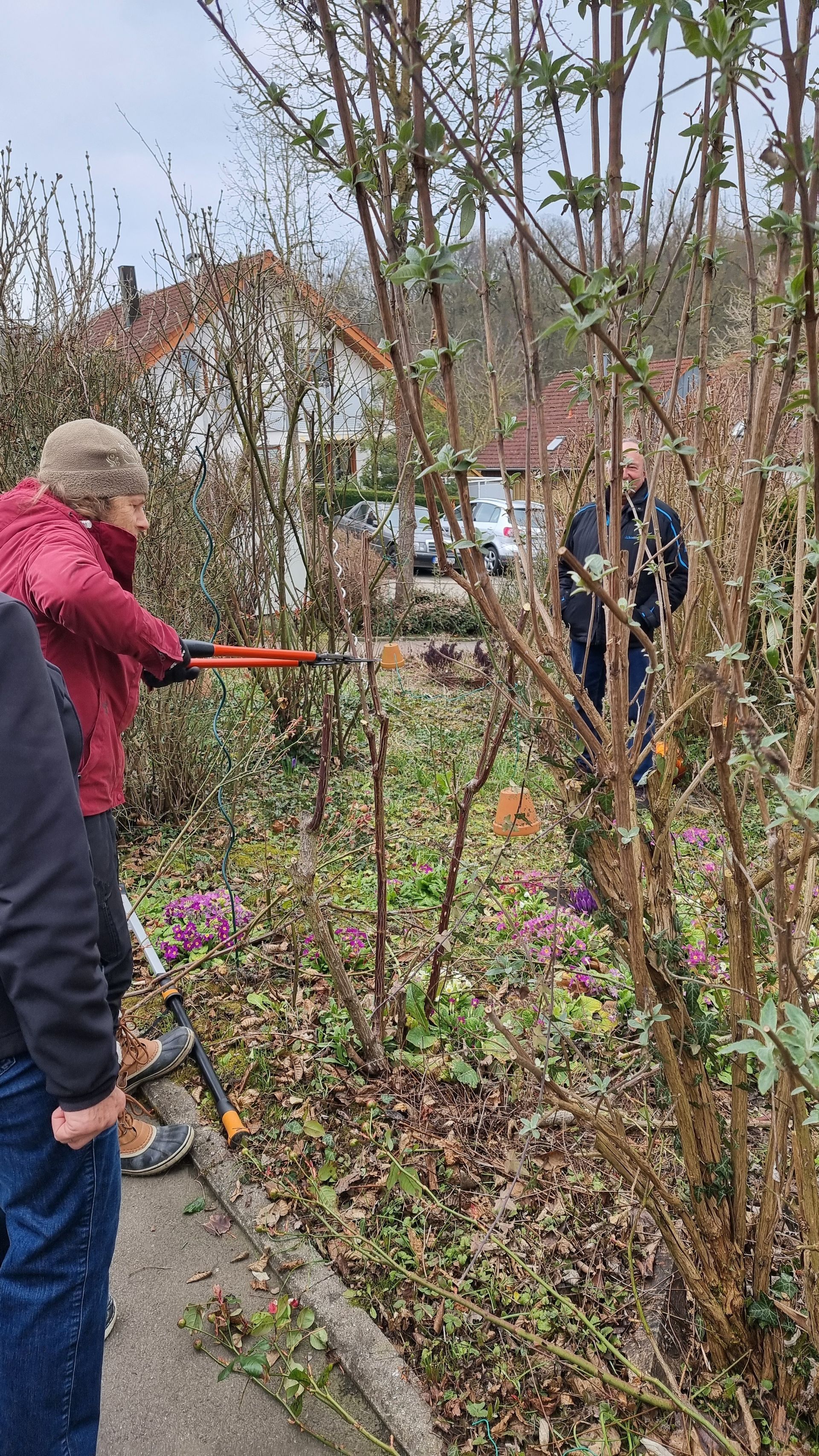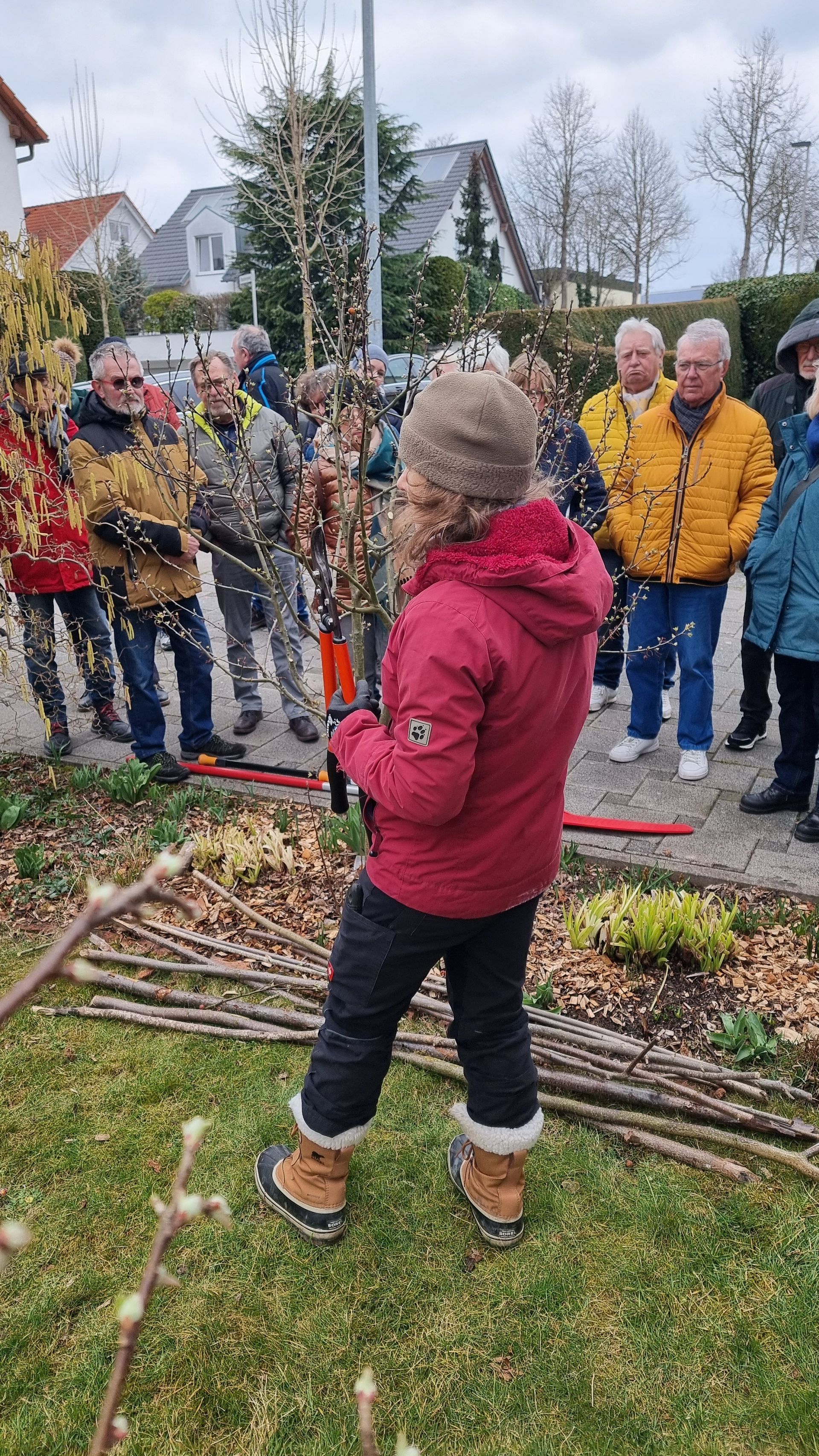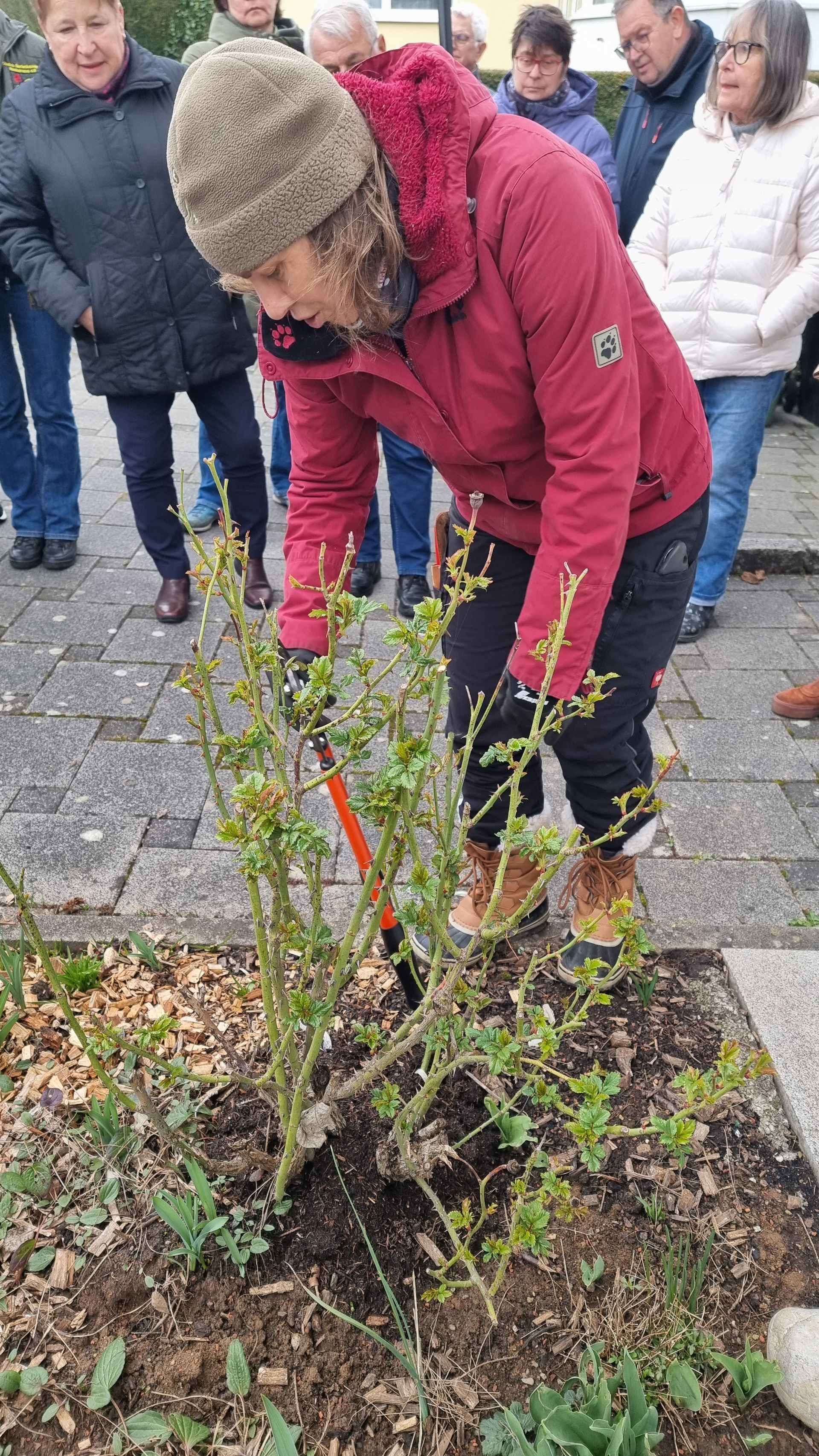 Sie fing bei einer Rose an, die sie beim letzten Mal sehr eingekürzt hatte und stellte fest, dass sie sich hervorragend entwickelt hatte. Ihre Schnittwerkzeuge kamen natürlich auch wieder bei dieser Rose zum Einsatz, so dass eine Nachbarin dazu animiert wurde, Fr. Rist auch ihre, schon lange nicht mehr geschnittene Rose, zu zeigen. Daraufhin begaben wir uns zum Nachbargrundstück und Frau Rist zeigte uns dort, wie man diese Rose wieder beleben konnte. Weiter ging es dann im Grundstück der Familie Riegraf, wo sie uns an diversen Gehölzen, u.a. Sommerflieder (Buddleja), Flieder (Syringa), Zierapfel, Forsythien, Weigelie, etc., zeigte, wie man die Sträucher wieder aktivieren und zu einer schönen Blüte bringen kann. Einige Sträucher wurden „nur“ ausgelichtet, bei anderen fiel der Schnitt radikaler aus 😉, d.h. es fiel natürlich auch dieses Mal wieder einiges an Schnittgut an.