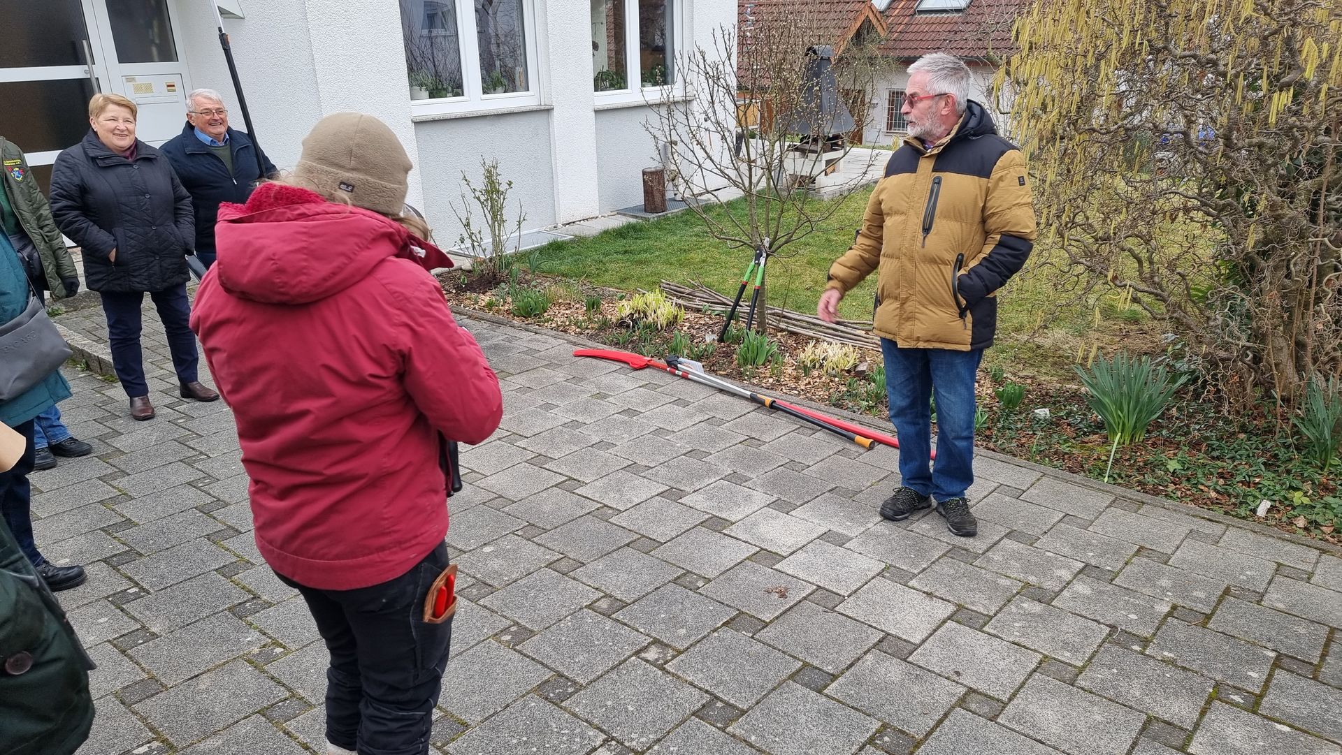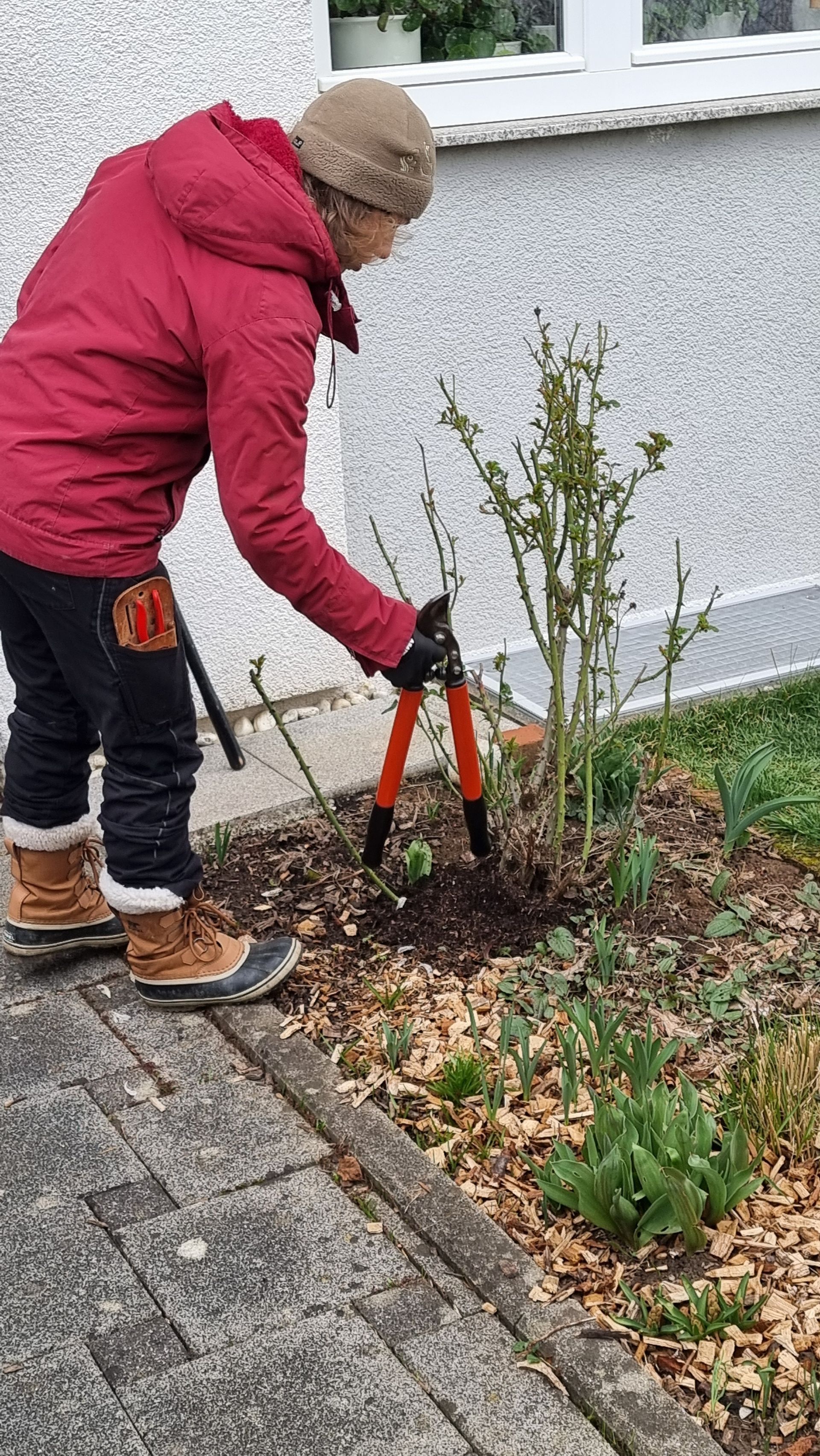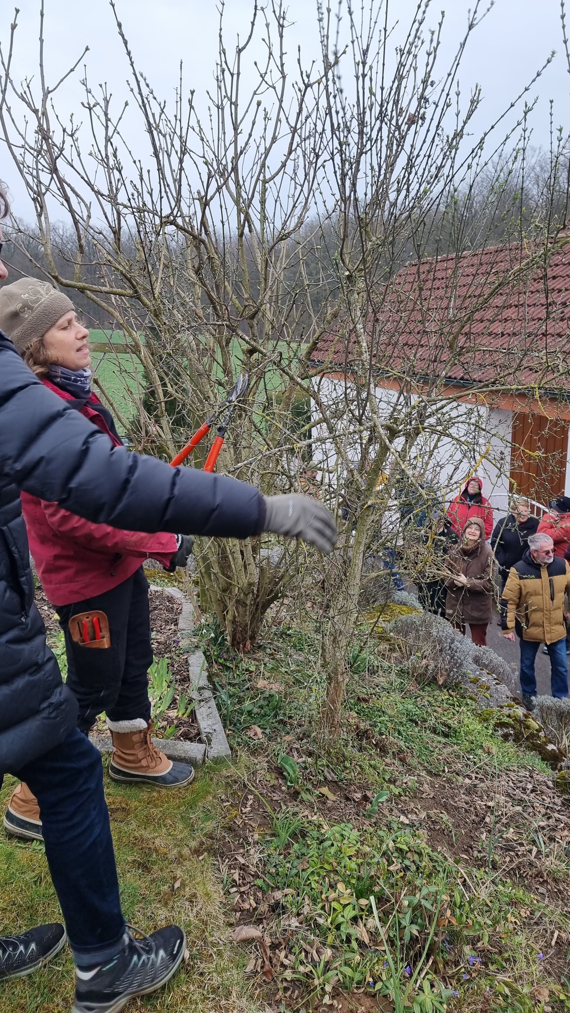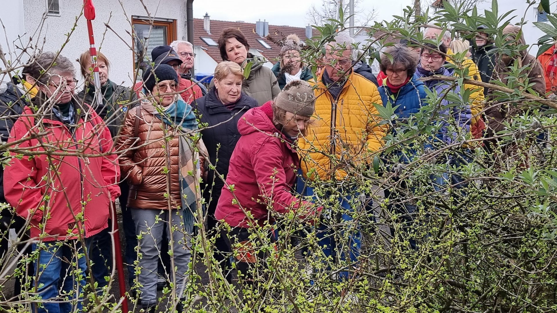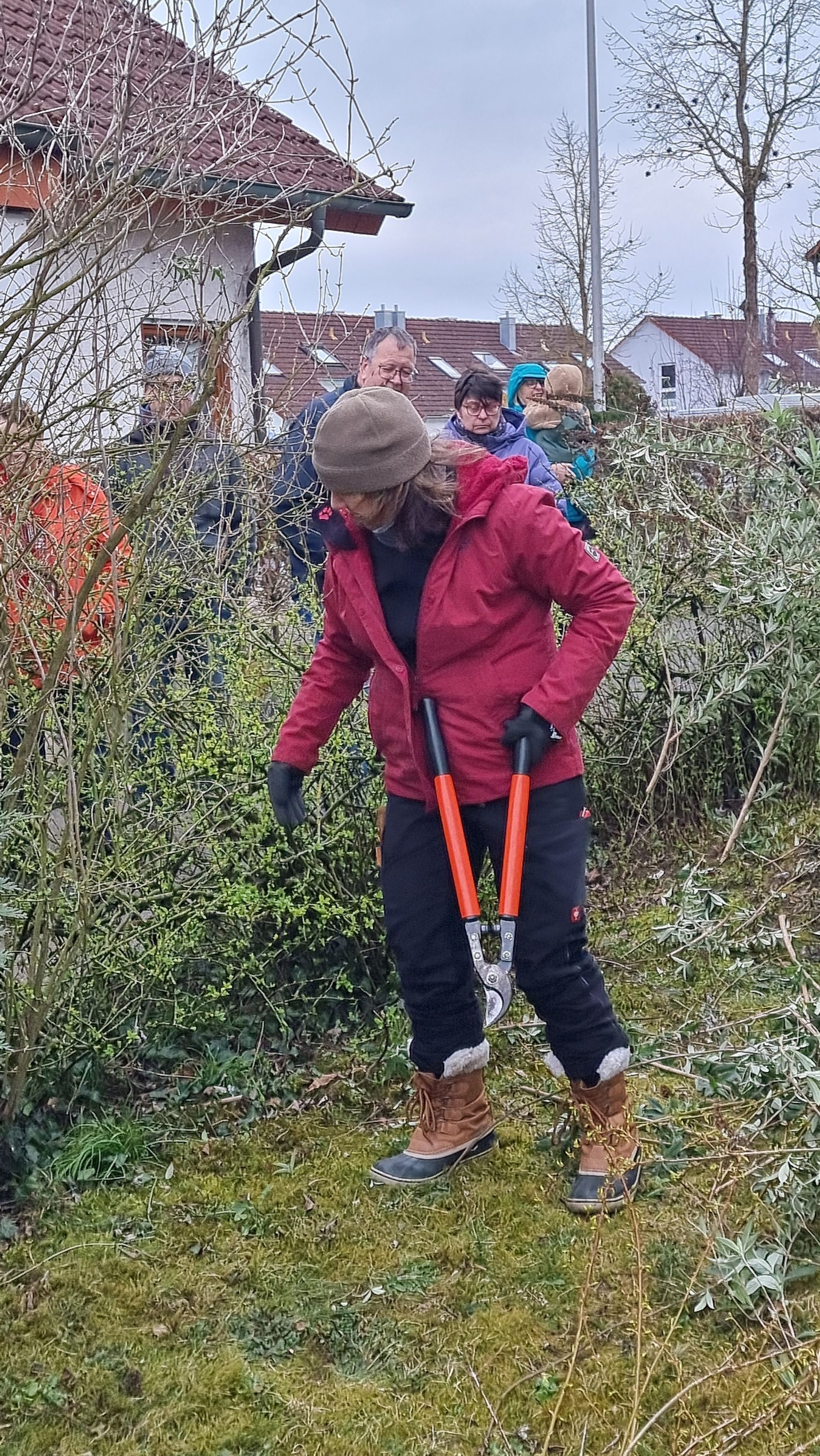 Sie fing bei einer Rose an, die sie beim letzten Mal sehr eingekürzt hatte und stellte fest, dass sie sich hervorragend entwickelt hatte. Ihre Schnittwerkzeuge kamen natürlich auch wieder bei dieser Rose zum Einsatz, so dass eine Nachbarin dazu animiert wurde, Fr. Rist auch ihre, schon lange nicht mehr geschnittene Rose, zu zeigen. Daraufhin begaben wir uns zum Nachbargrundstück und Frau Rist zeigte uns dort, wie man diese Rose wieder beleben konnte. Weiter ging es dann im Grundstück der Familie Riegraf, wo sie uns an diversen Gehölzen, u.a. Sommerflieder (Buddleja), Flieder (Syringa), Zierapfel, Forsythien, Weigelie, etc., zeigte, wie man die Sträucher wieder aktivieren und zu einer schönen Blüte bringen kann. Einige Sträucher wurden „nur“ ausgelichtet, bei anderen fiel der Schnitt radikaler aus 😉, d.h. es fiel natürlich auch dieses Mal wieder einiges an Schnittgut an.