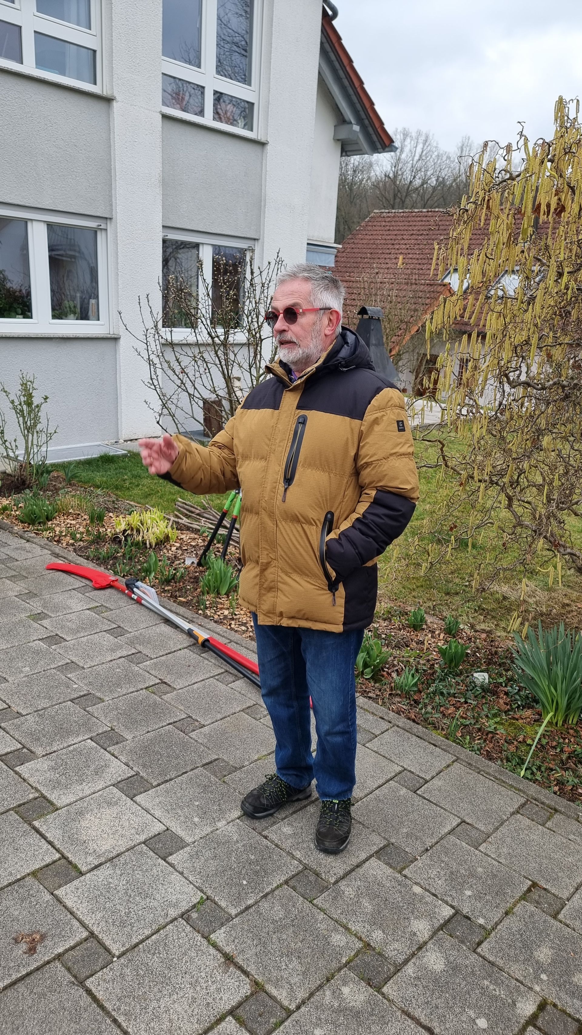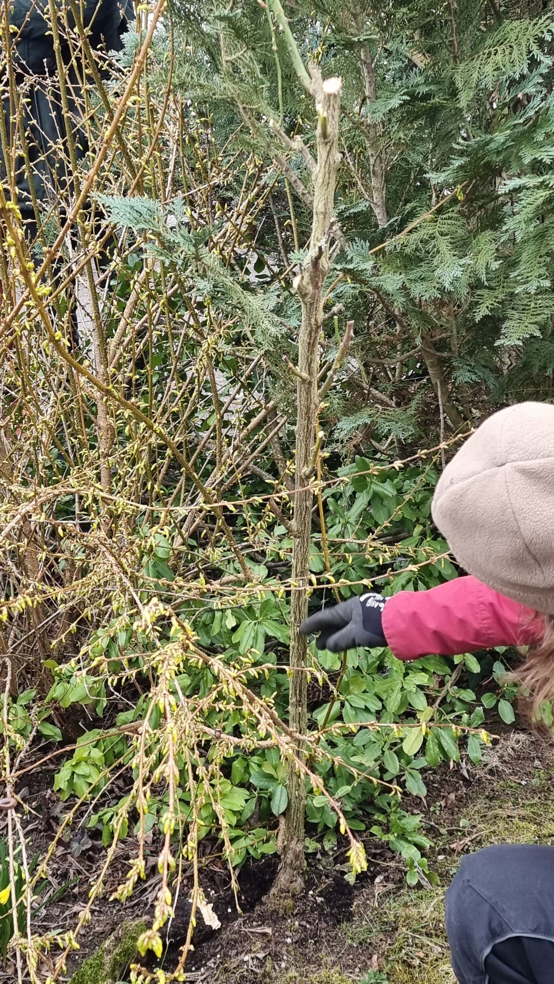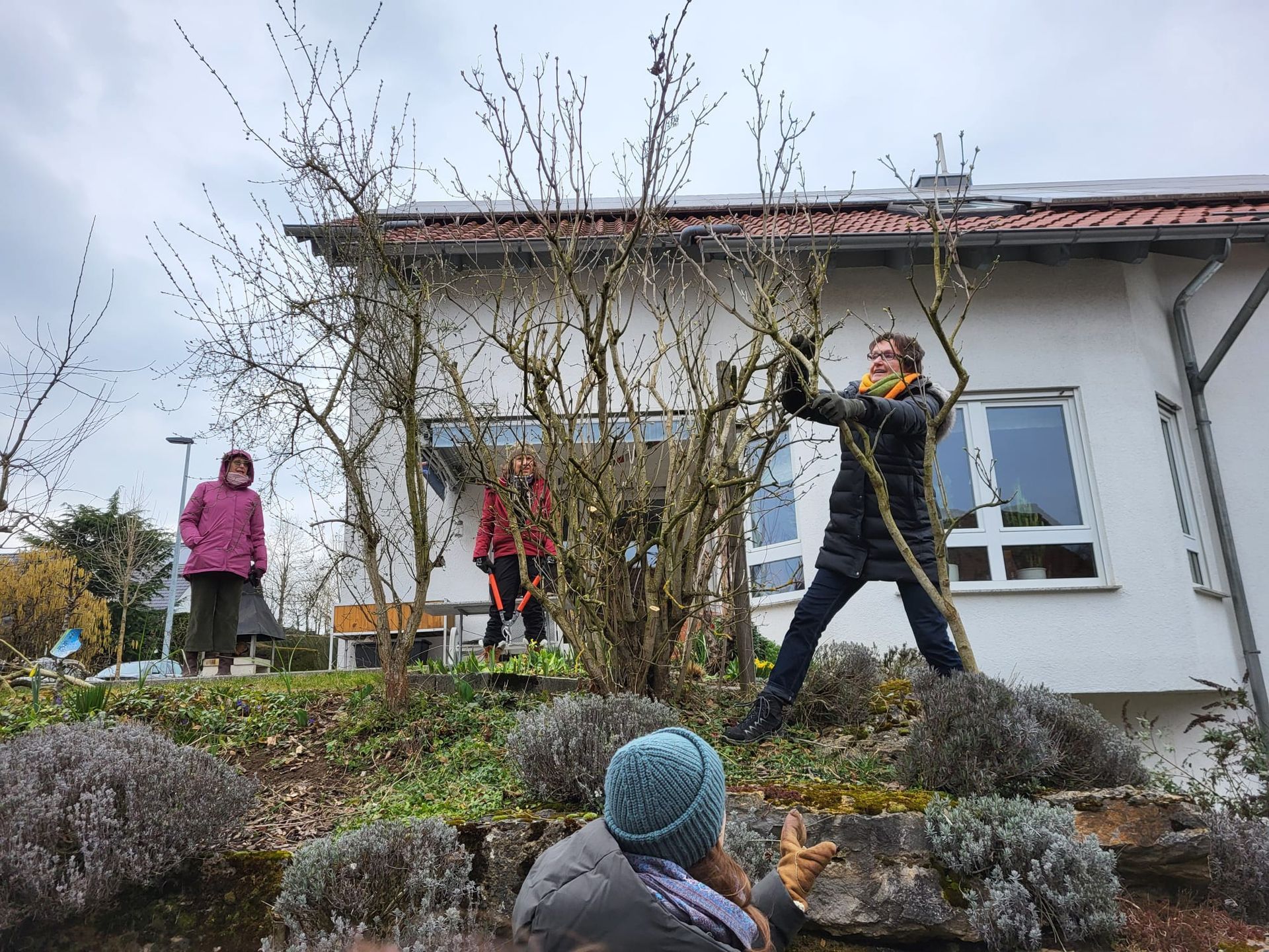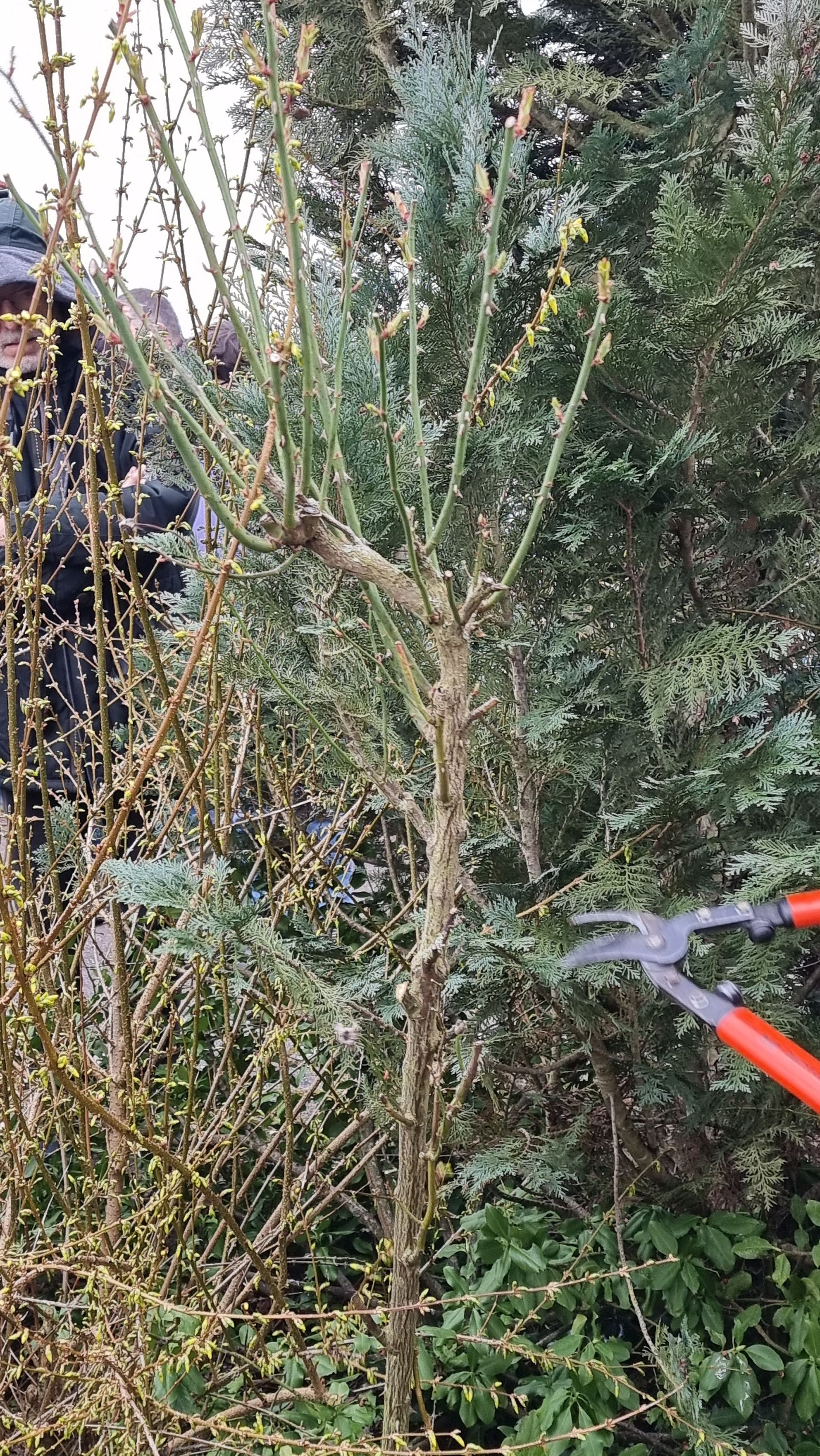 Sie fing bei einer Rose an, die sie beim letzten Mal sehr eingekürzt hatte und stellte fest, dass sie sich hervorragend entwickelt hatte. Ihre Schnittwerkzeuge kamen natürlich auch wieder bei dieser Rose zum Einsatz, so dass eine Nachbarin dazu animiert wurde, Fr. Rist auch ihre, schon lange nicht mehr geschnittene Rose, zu zeigen. Daraufhin begaben wir uns zum Nachbargrundstück und Frau Rist zeigte uns dort, wie man diese Rose wieder beleben konnte. Weiter ging es dann im Grundstück der Familie Riegraf, wo sie uns an diversen Gehölzen, u.a. Sommerflieder (Buddleja), Flieder (Syringa), Zierapfel, Forsythien, Weigelie, etc., zeigte, wie man die Sträucher wieder aktivieren und zu einer schönen Blüte bringen kann. Einige Sträucher wurden „nur“ ausgelichtet, bei anderen fiel der Schnitt radikaler aus 😉, d.h. es fiel natürlich auch dieses Mal wieder einiges an Schnittgut an.