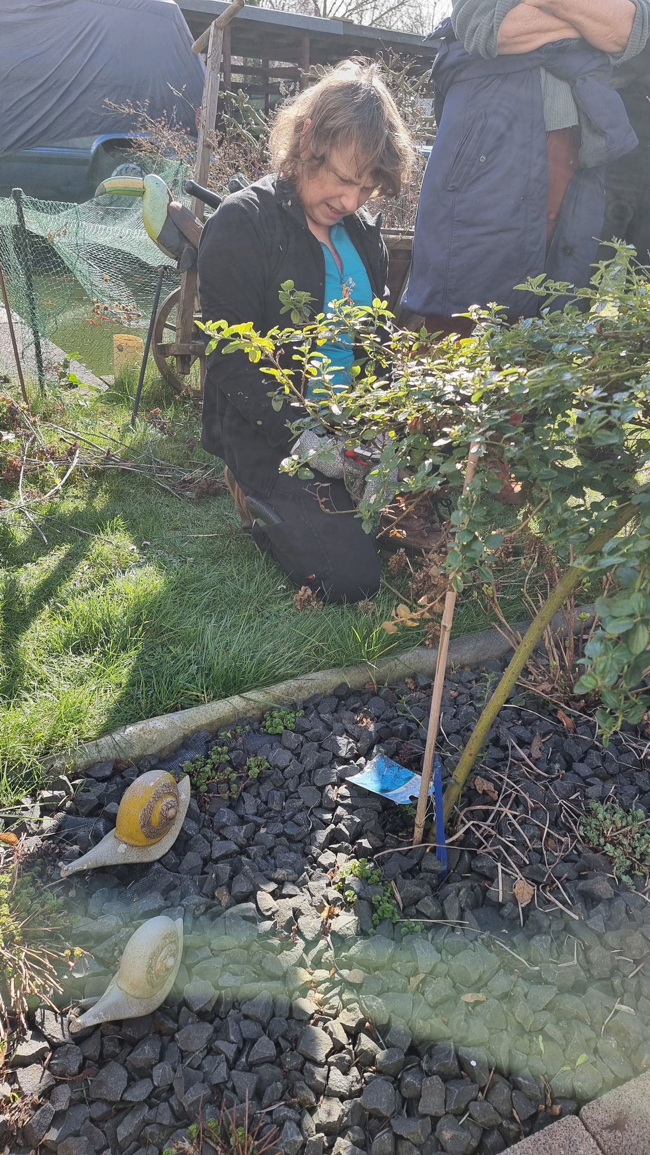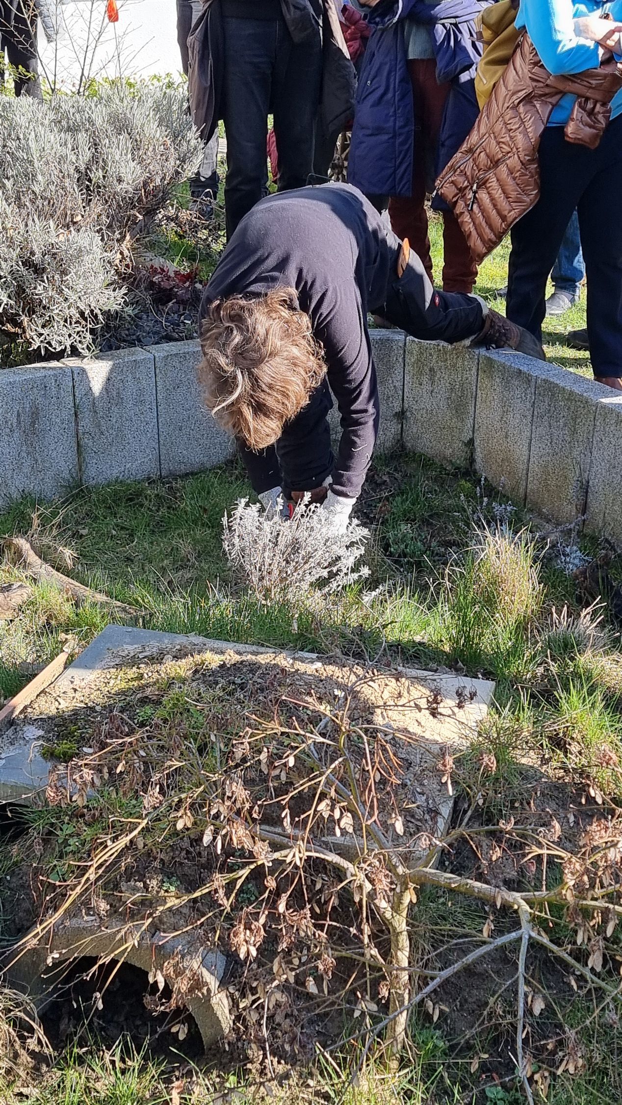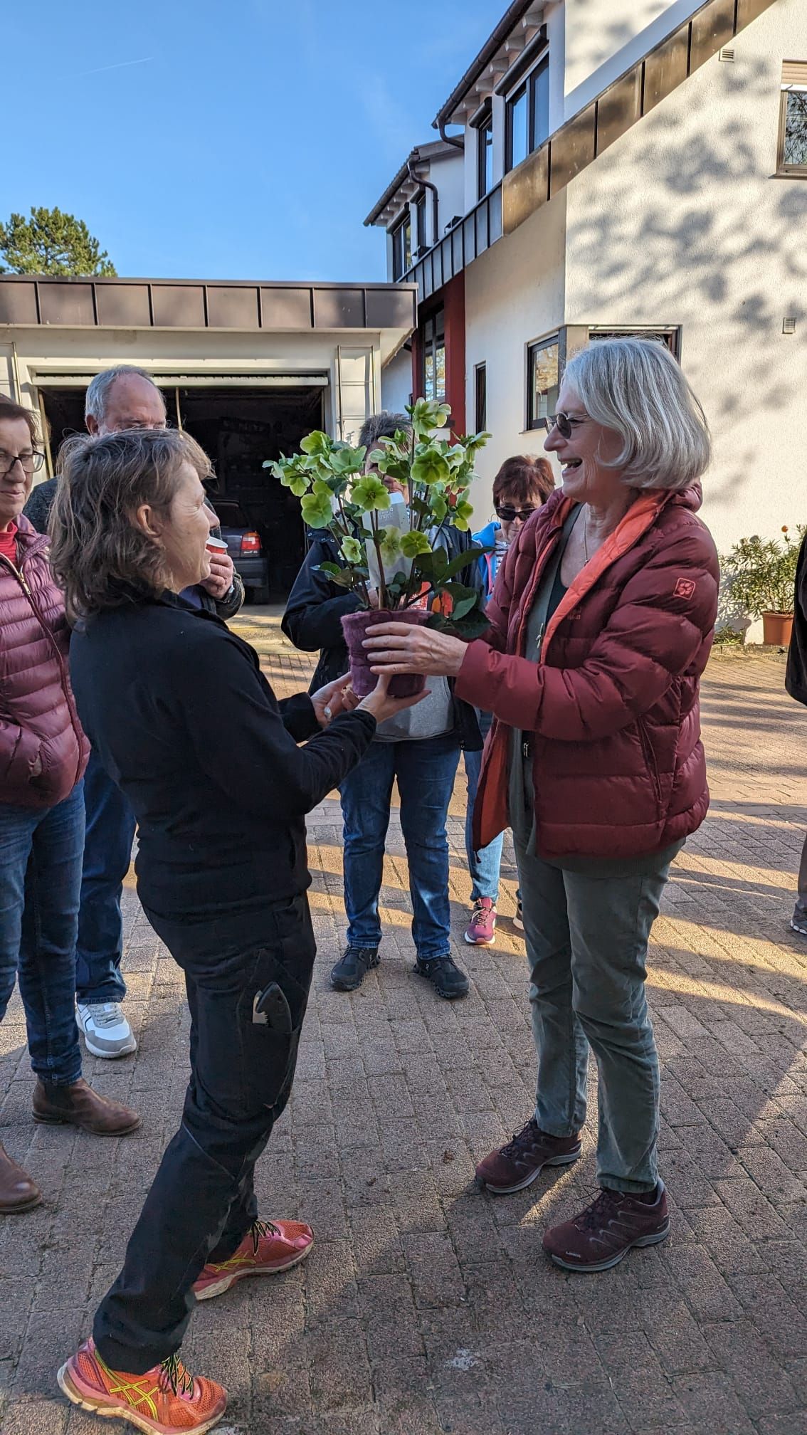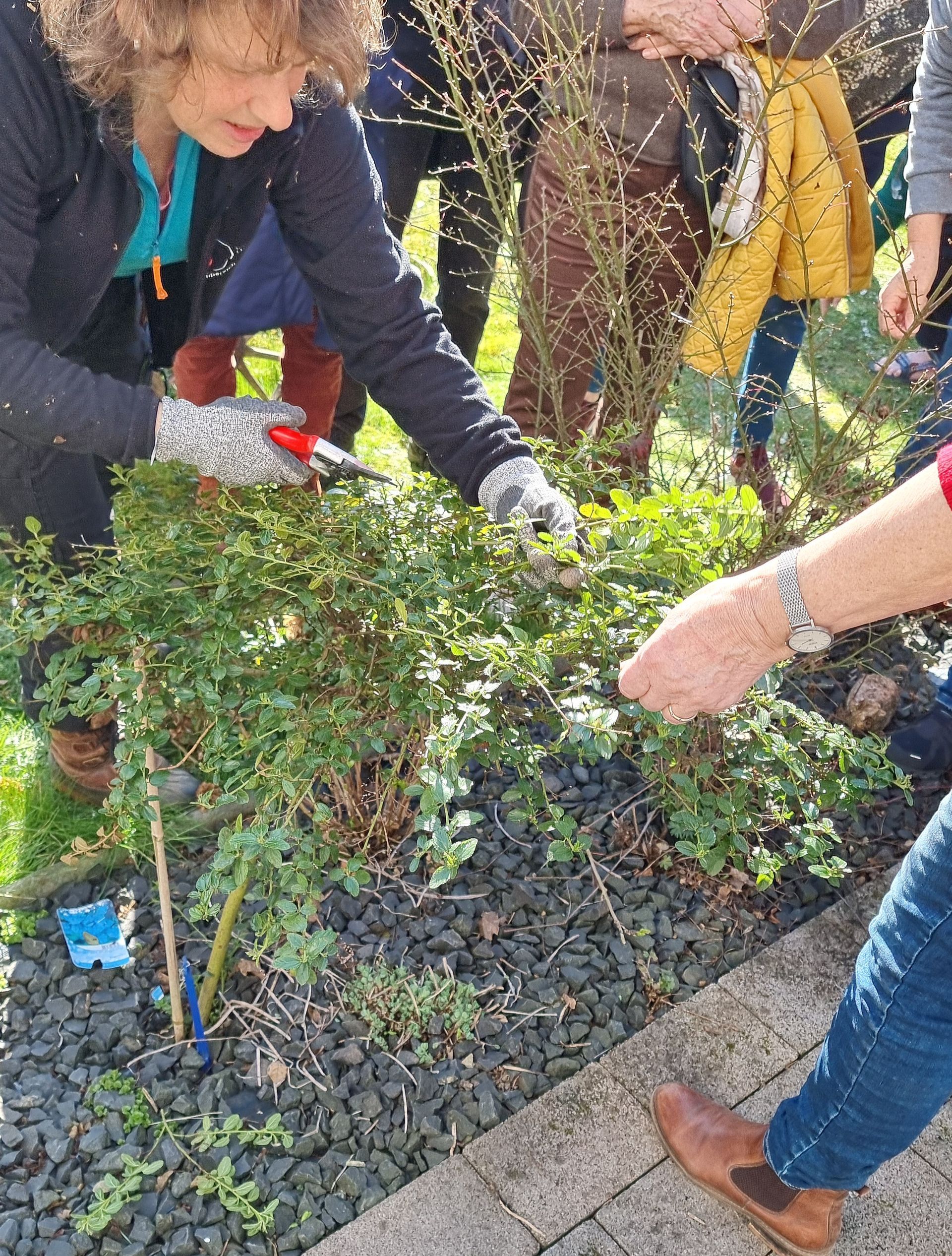 Wir hatten auf dem Grundstück der Familie Keppler eher jüngere Anpflanzungen, was aber nicht hieß, dass nicht geschnitten werden musste. Frau Rist erklärte sehr ausführlich an diversen Hibisken, Rosen, Lavendel, einem Zierahorn, einer Jostabeere, einer Kriechenden Säckelblume (Ceanothus thyrsiflorus var. Repens), u.a., was geschnitten werden muss, damit die Pflanze wieder zu ihrer alten Pracht und Blühfreudigkeit zurückkehrt. Auch das Ableiten von Ästen war ein Thema, was oft genug nicht genügend angewendet wird. Frau Rist sprach auch ausführlich über Düngung und dass organischer Dünger zu bevorzugen ist.