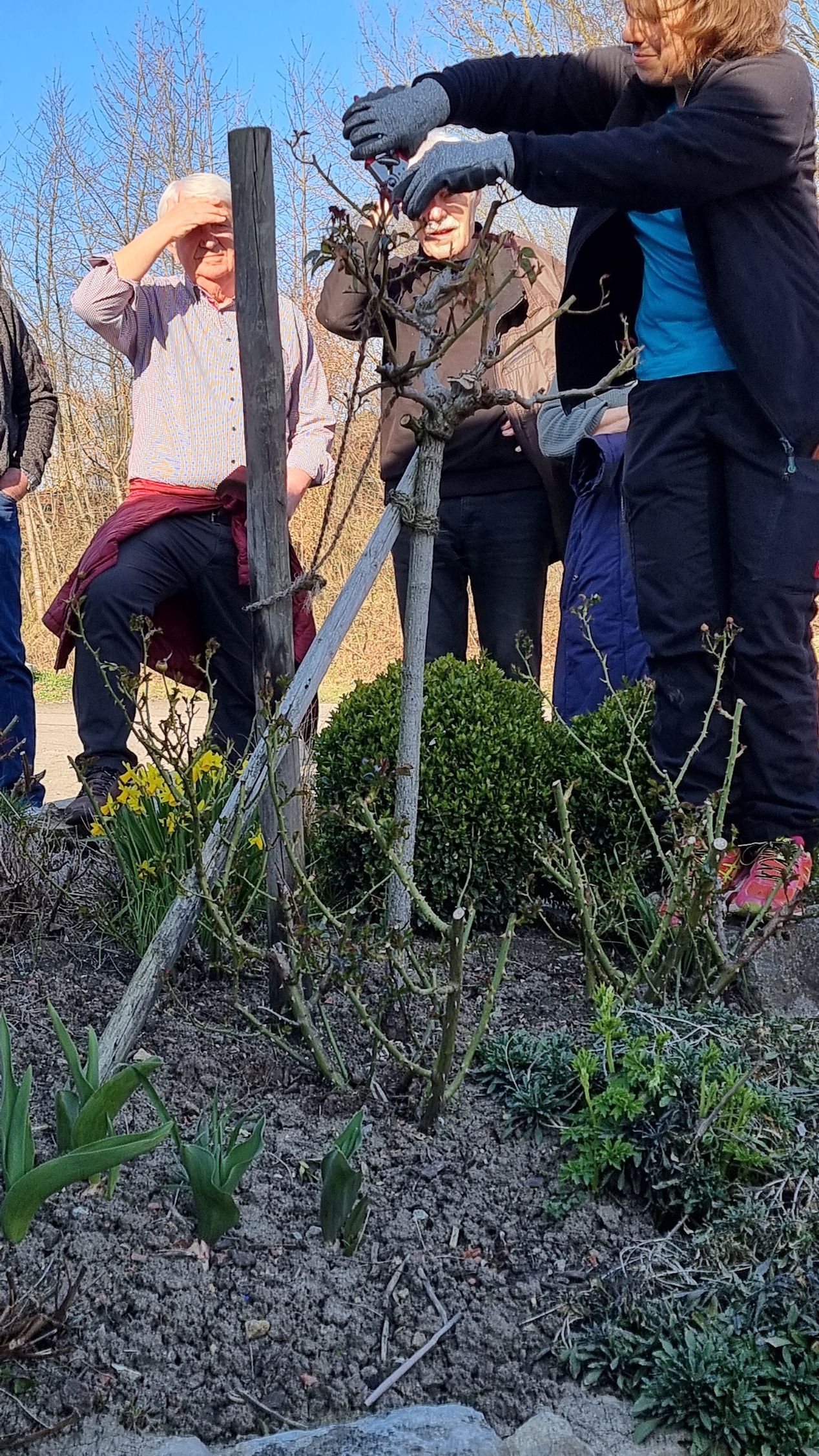 Bei schönstem Frühlingswetter trafen eine große Anzahl von Interessierten um 14 Uhr am Grundstück der Familie Keppler in Remseck-Hochberg ein. Frau Martina Rist, die diese Schnittkurse schon öfters bei uns durchgeführt hat, stellte sich vor und wir ließen auch kurz ihre beiden letzten Schnittkurse bei uns Revue passieren, bei denen doch eine sehr große Menge Schnittgut zusammengekommen war, nicht immer zur Freude der Besitzer 😉. Aber wir alle wissen, dass die Gehölze und Stauden nach dem Schnitt umso schöner blühen und gedeihen.