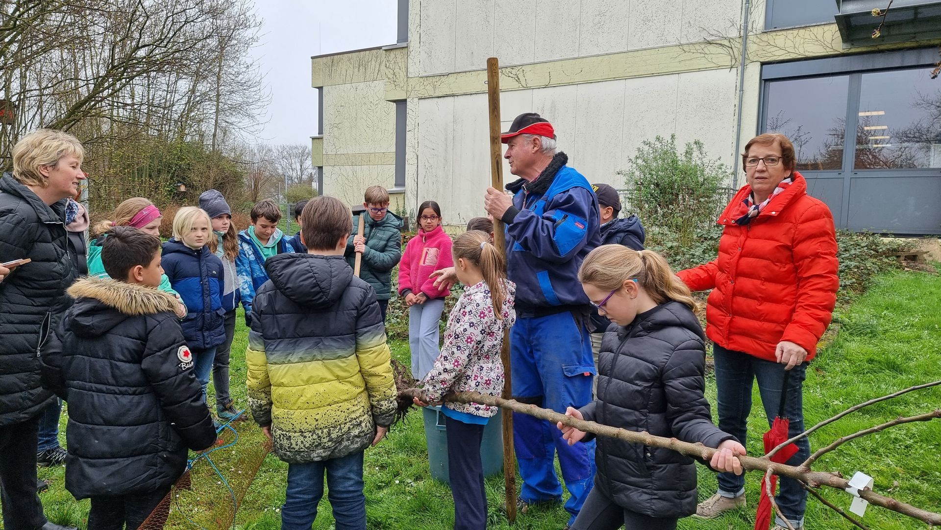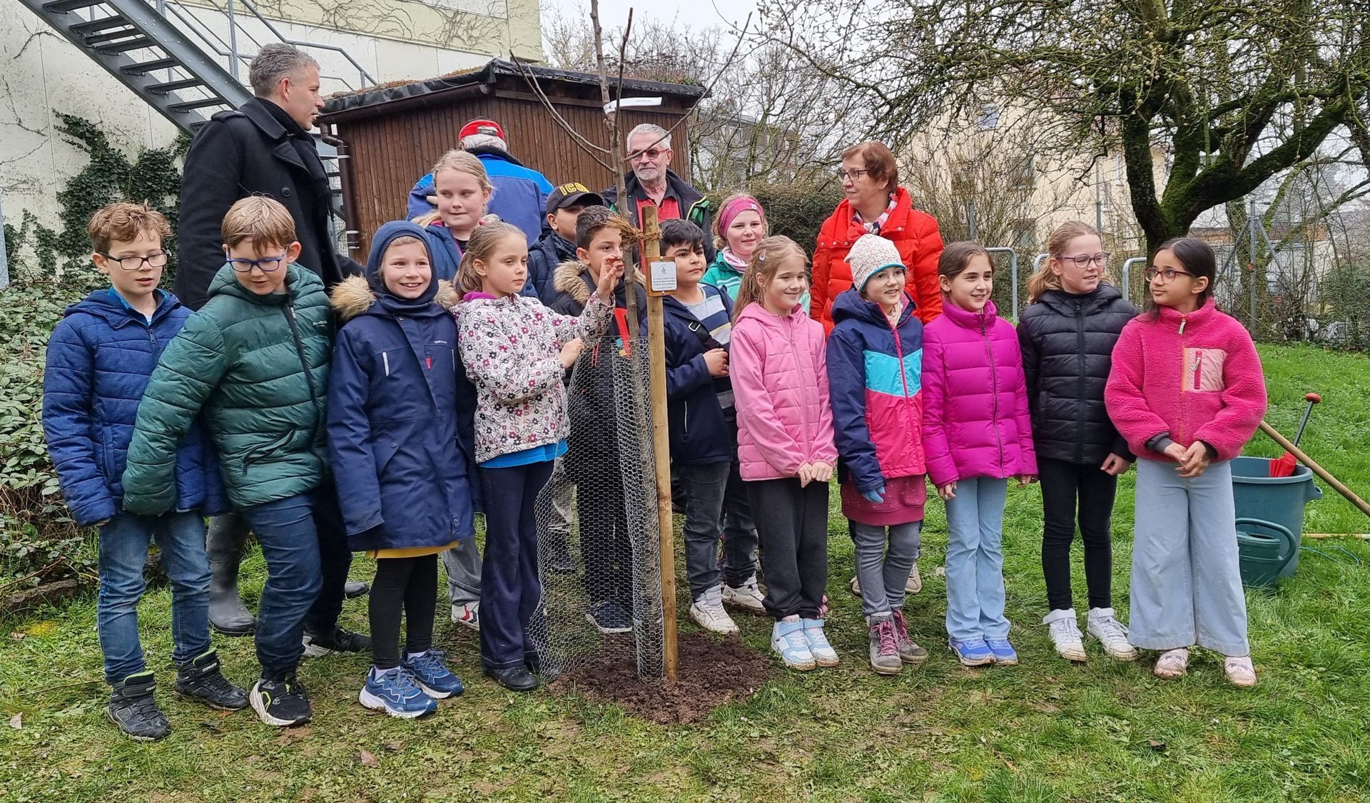 Übergabe Spendenscheck an Förderverein der Grundschule Hochberg e.V. und Pflanzung eines Apfelbaums mit der Klasse 3 der Grundschule am 13. März 2024