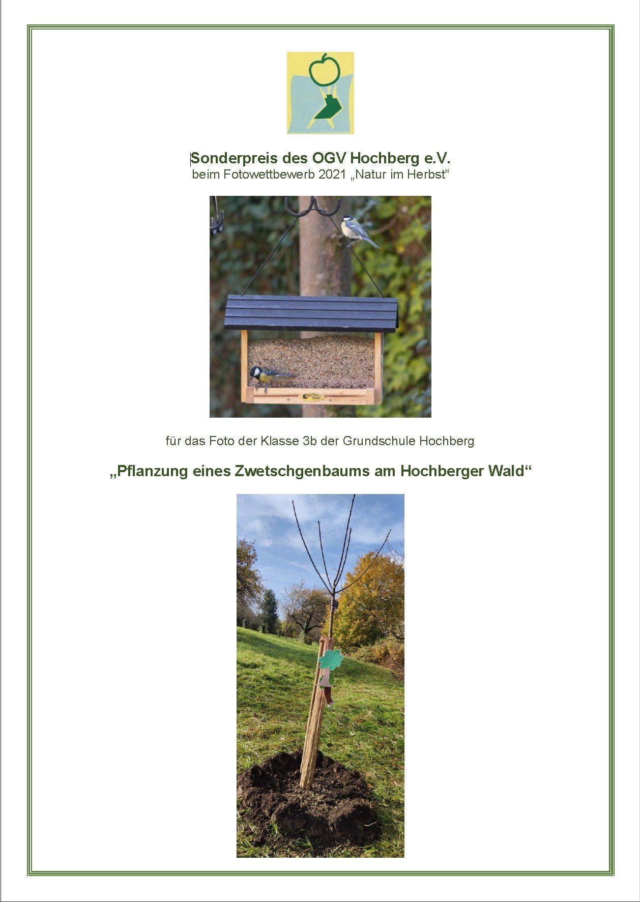Die Schüler und Schülerinnen der Klasse 3 b hatten unter Anleitung und Zusammenarbeit mit Frau Lausmann im Herbst 2021 einen Zwetschgenbaum am Hochberger Wald gepflanzt. Die Mutter eines Schülers machte hiervon ein Foto und reichte uns dies ein.