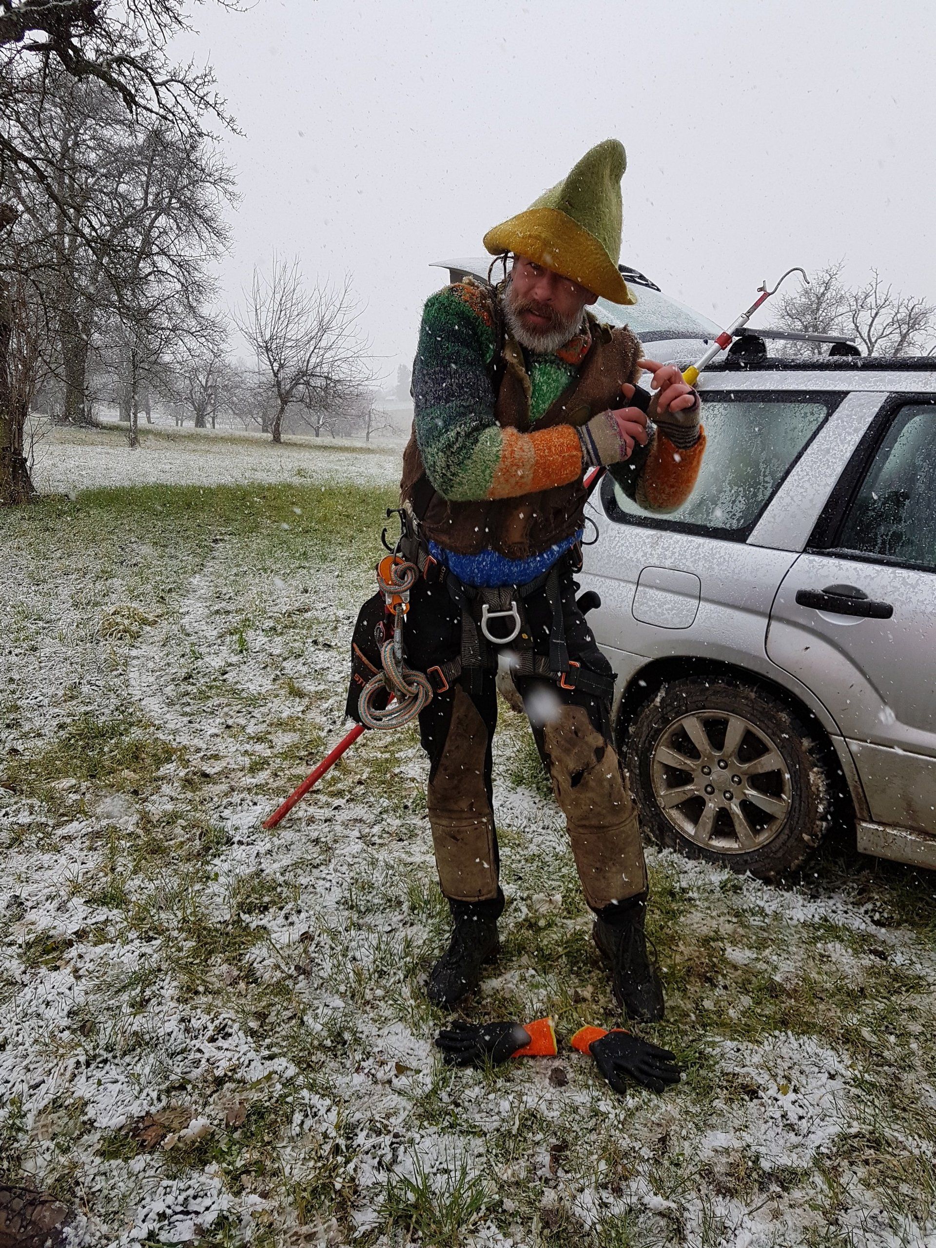 Nachdem der Apfelbaum schließlich so geschnitten war, dass er nun erst wieder in 4 Jahren einen Baumschnitt nötig haben wird, wandte sich Herr Seidel einem recht großen, schon recht alten und teilweise morschen Obstbaum zu. Er betonte, dass gerade diese alten, bereits mit Löchern und Ritzen versehenen Bäume, für unsere vielfältige, noch verbleibende Insektenpopulation absolut notwendig sind. Nichts desto trotz verkleinerte er diesen alten Baum etwas, indem er diverse größere, morsche Äste durch kräftiges Ziehen herunterriss.