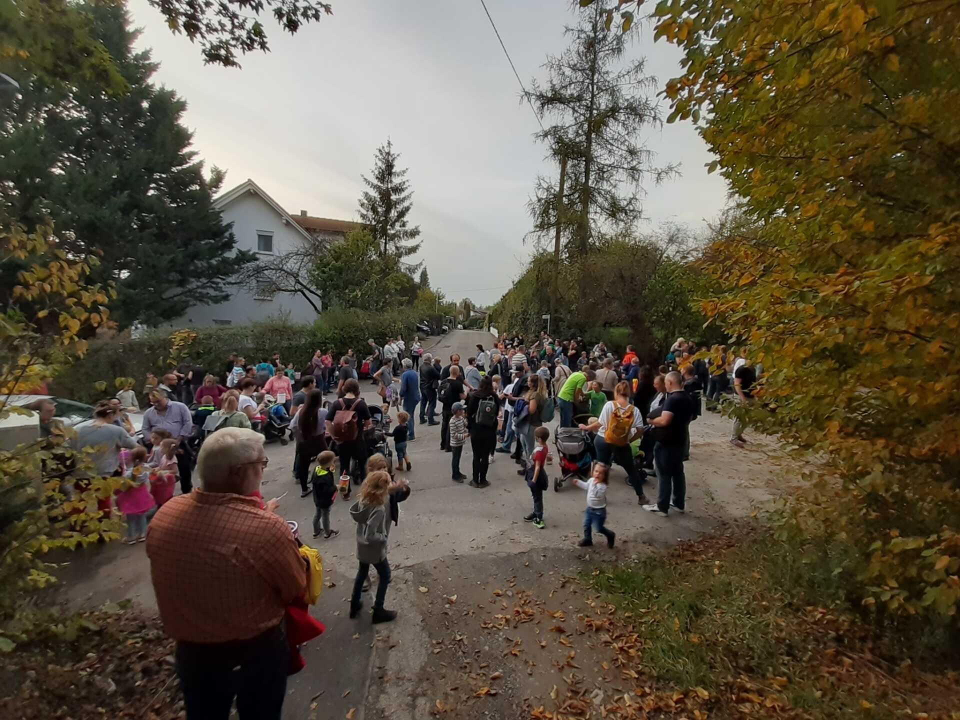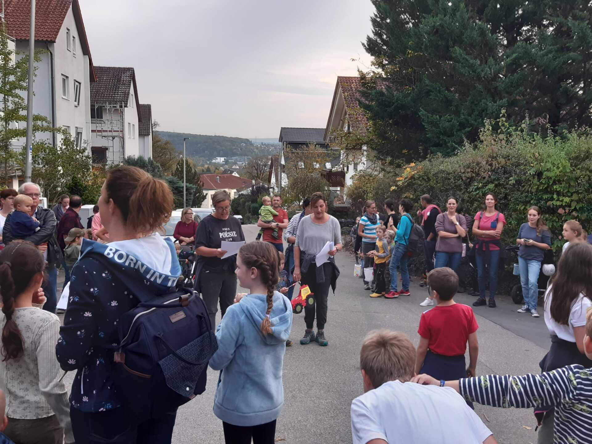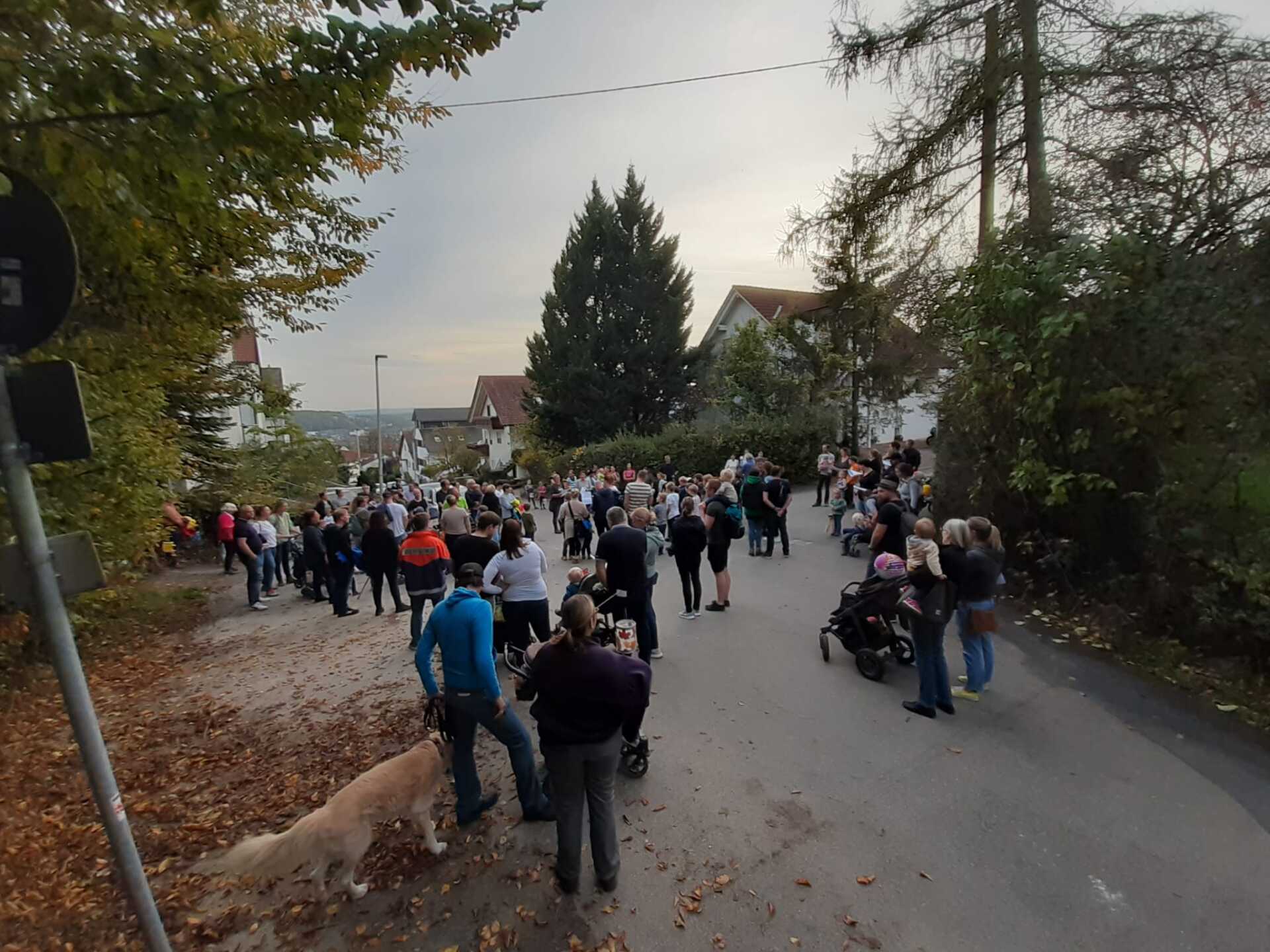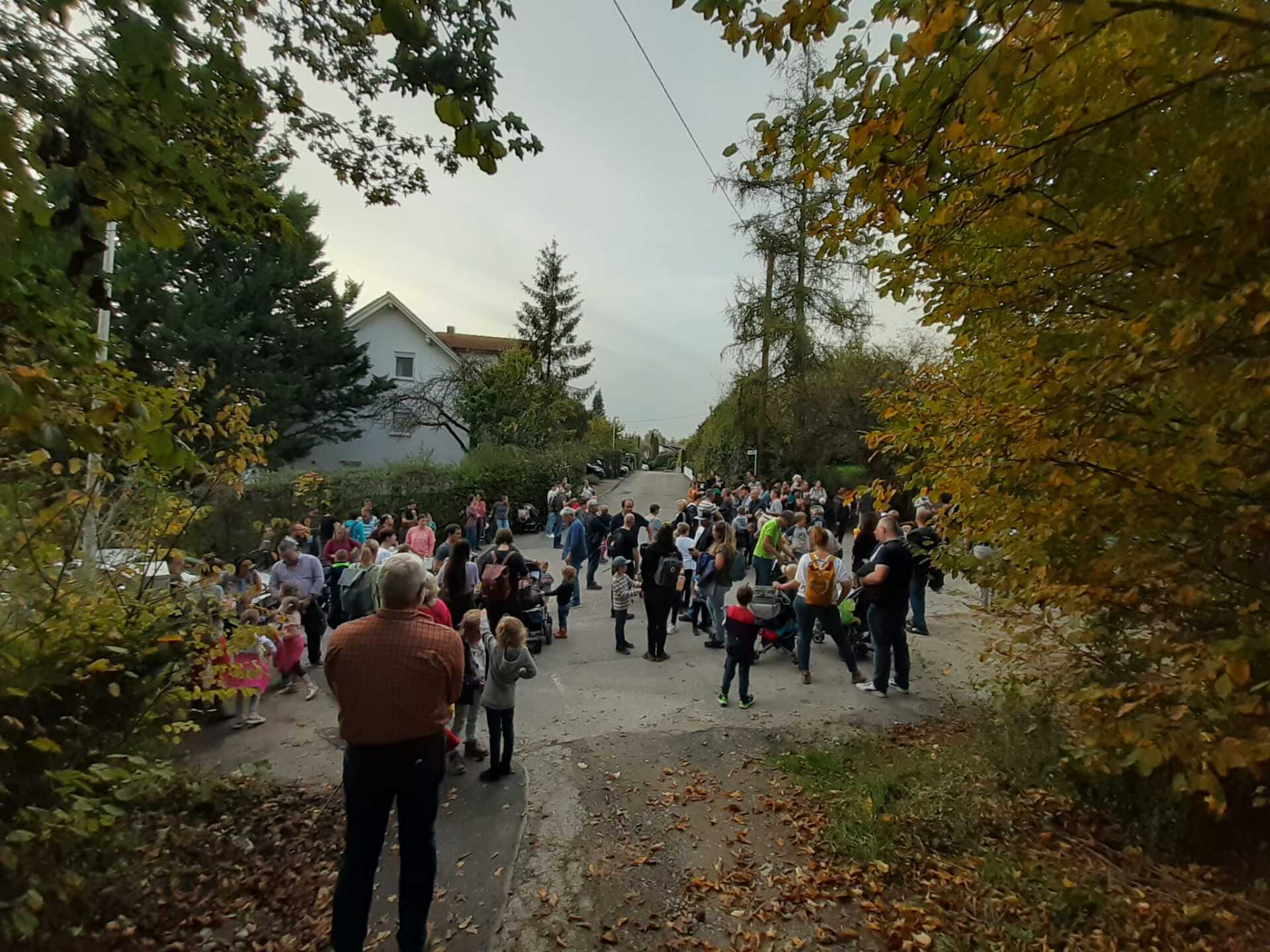 Mittlerweile sammelten sich die Kinder mit ihren Eltern am vereinbarten Treffpunkt, wo bereits mehrere Ausschussmitglieder auf sie warteten, und starteten ihre kleine Wanderung. Leider war es da noch etwas hell und die Kinder musste noch eine Weile warten, bis sie die Laternen anzünden konnten.