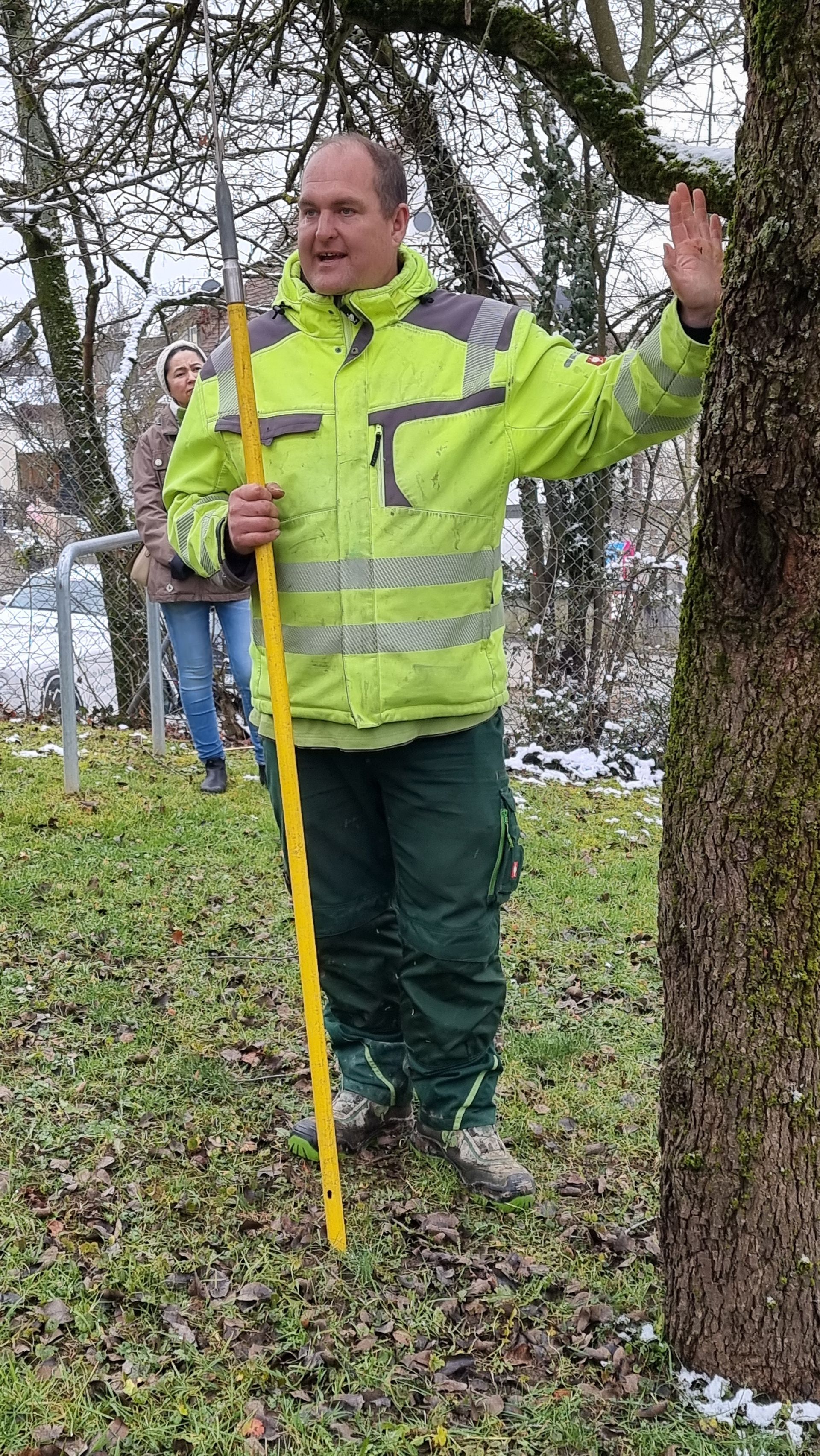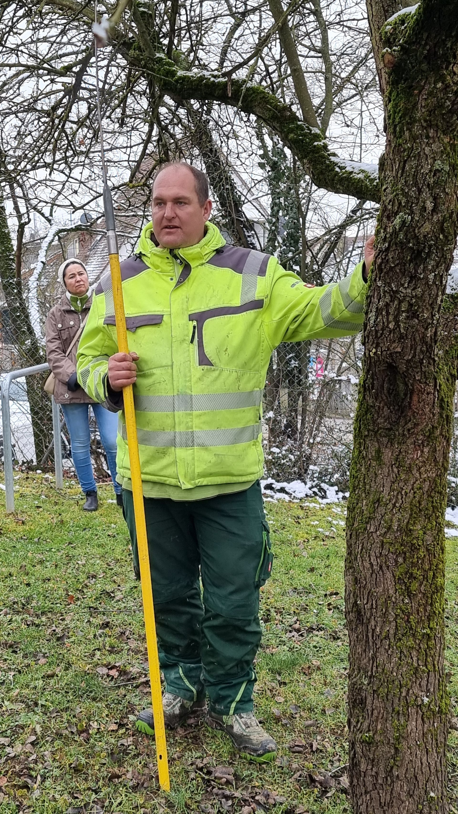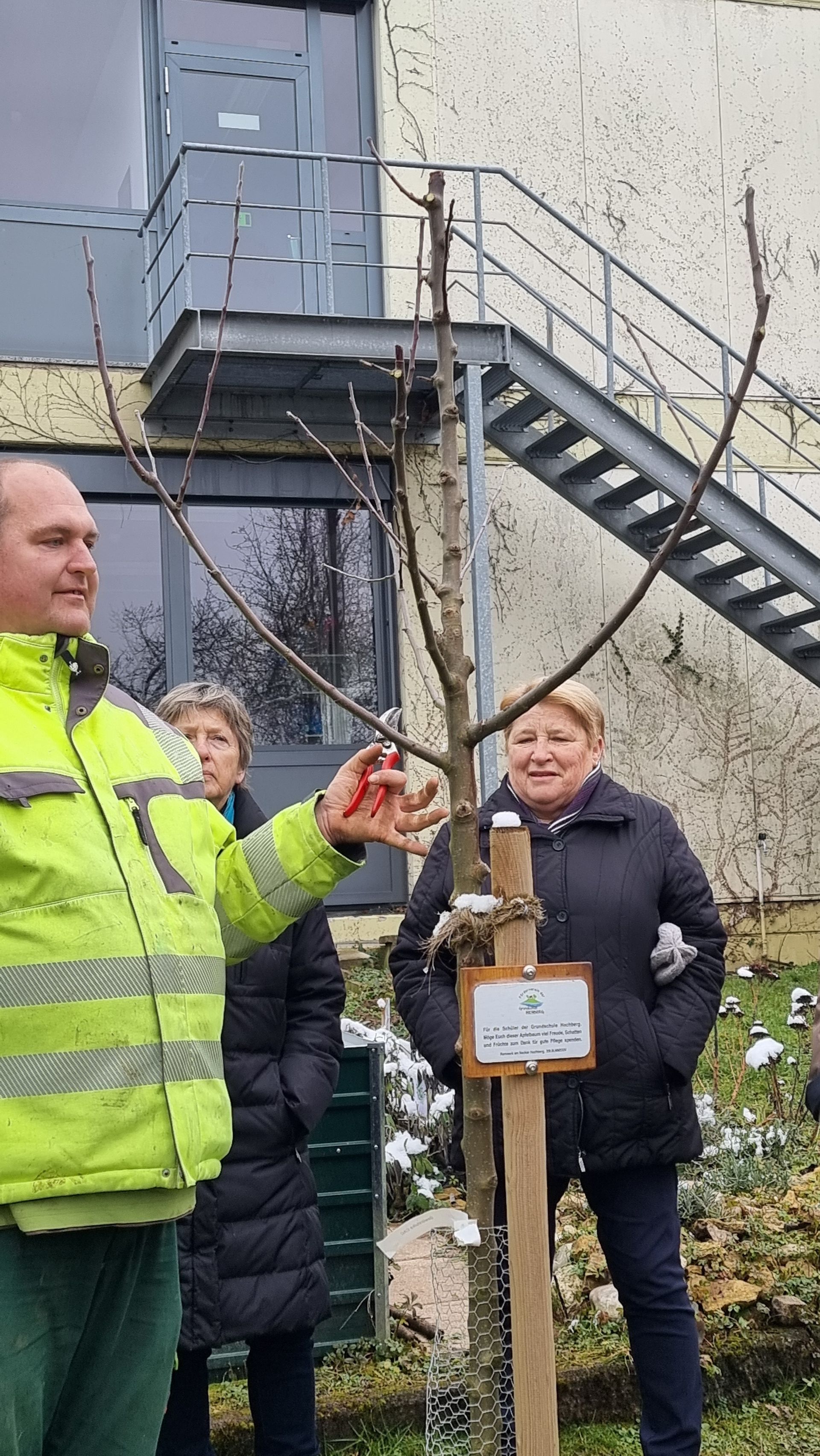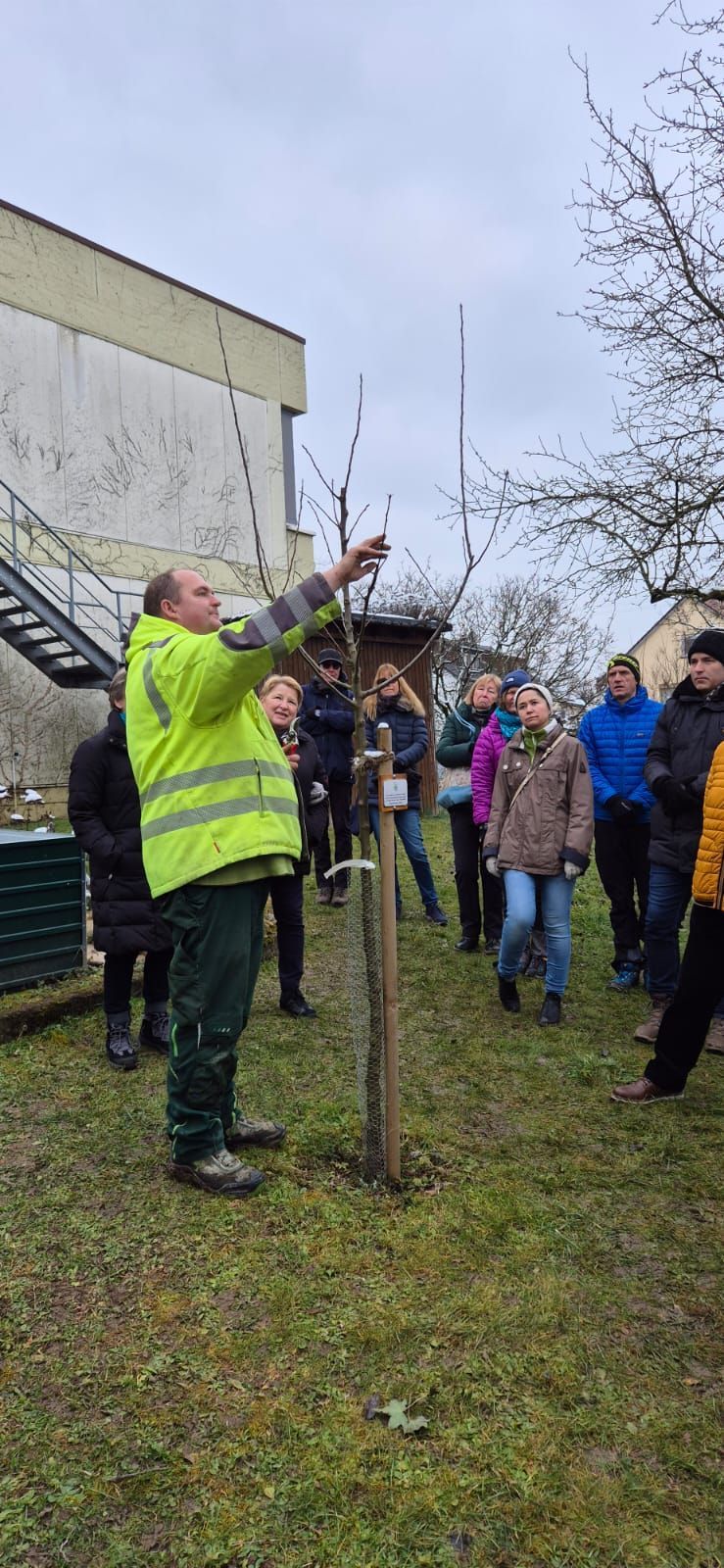 Als zweiten Baum nahm sich Herr Weißbarth dann einen im März 2024 gepflanzten Apfelbaum vor. Dieser Baum wurde vom Förderverein der Grundschule Hochberg für die Schüler der Grundschule gepflanzt.