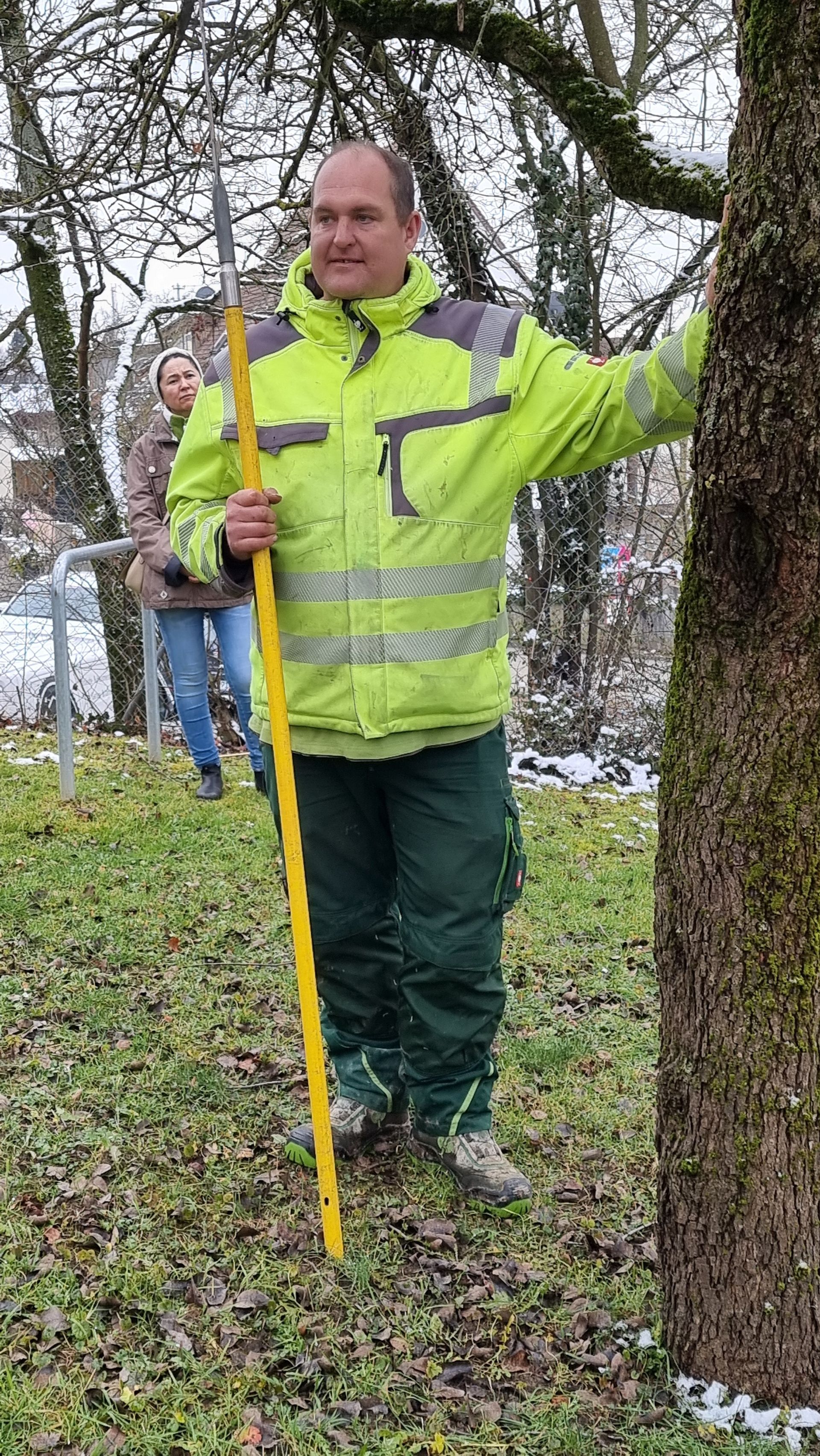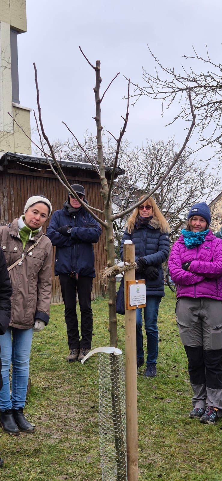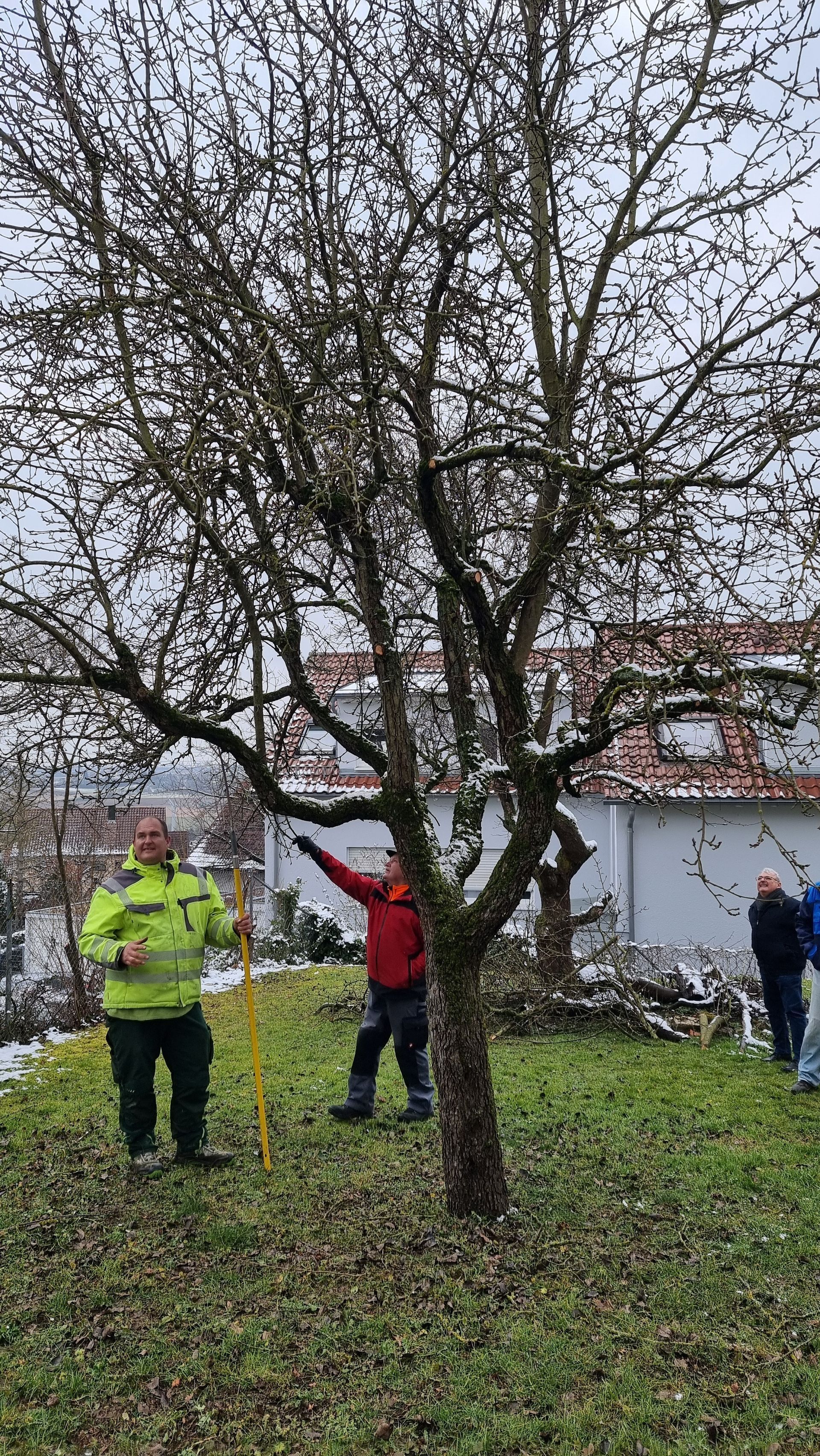 Als zweiten Baum nahm sich Herr Weißbarth dann einen im März 2024 gepflanzten Apfelbaum vor. Dieser Baum wurde vom Förderverein der Grundschule Hochberg für die Schüler der Grundschule gepflanzt.