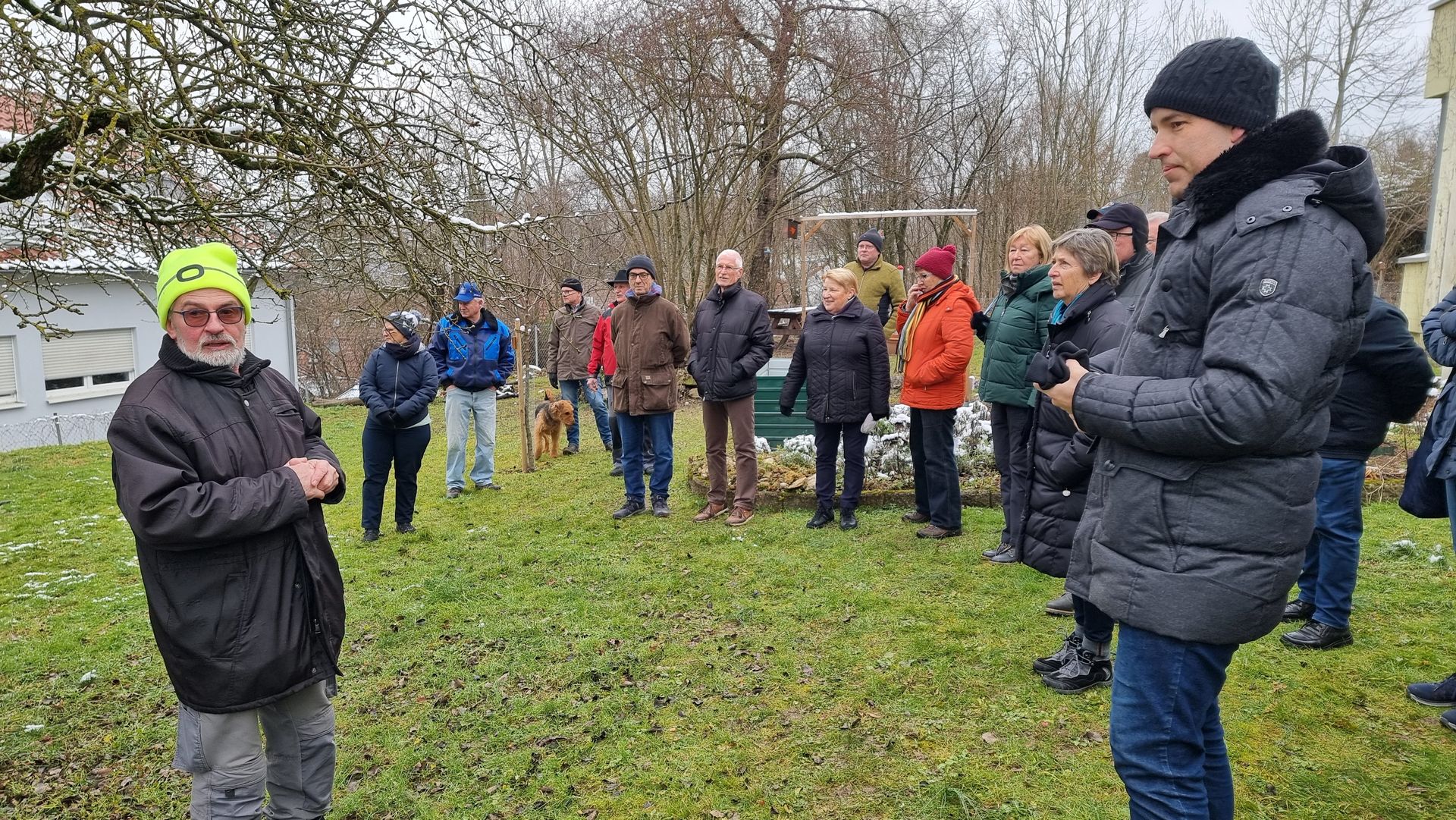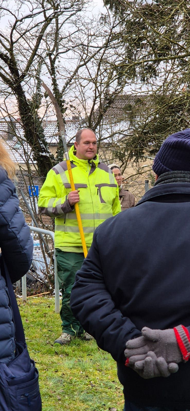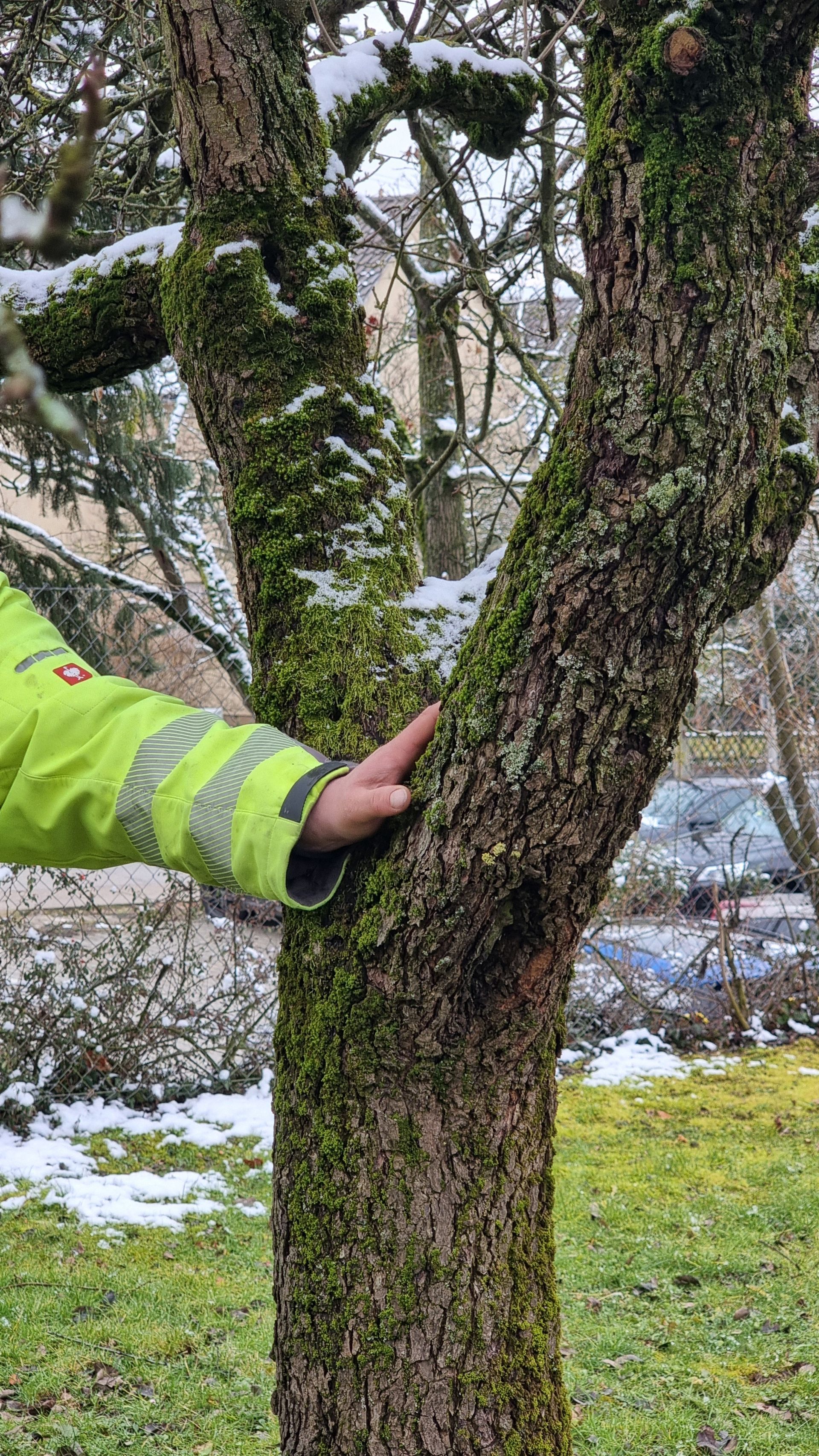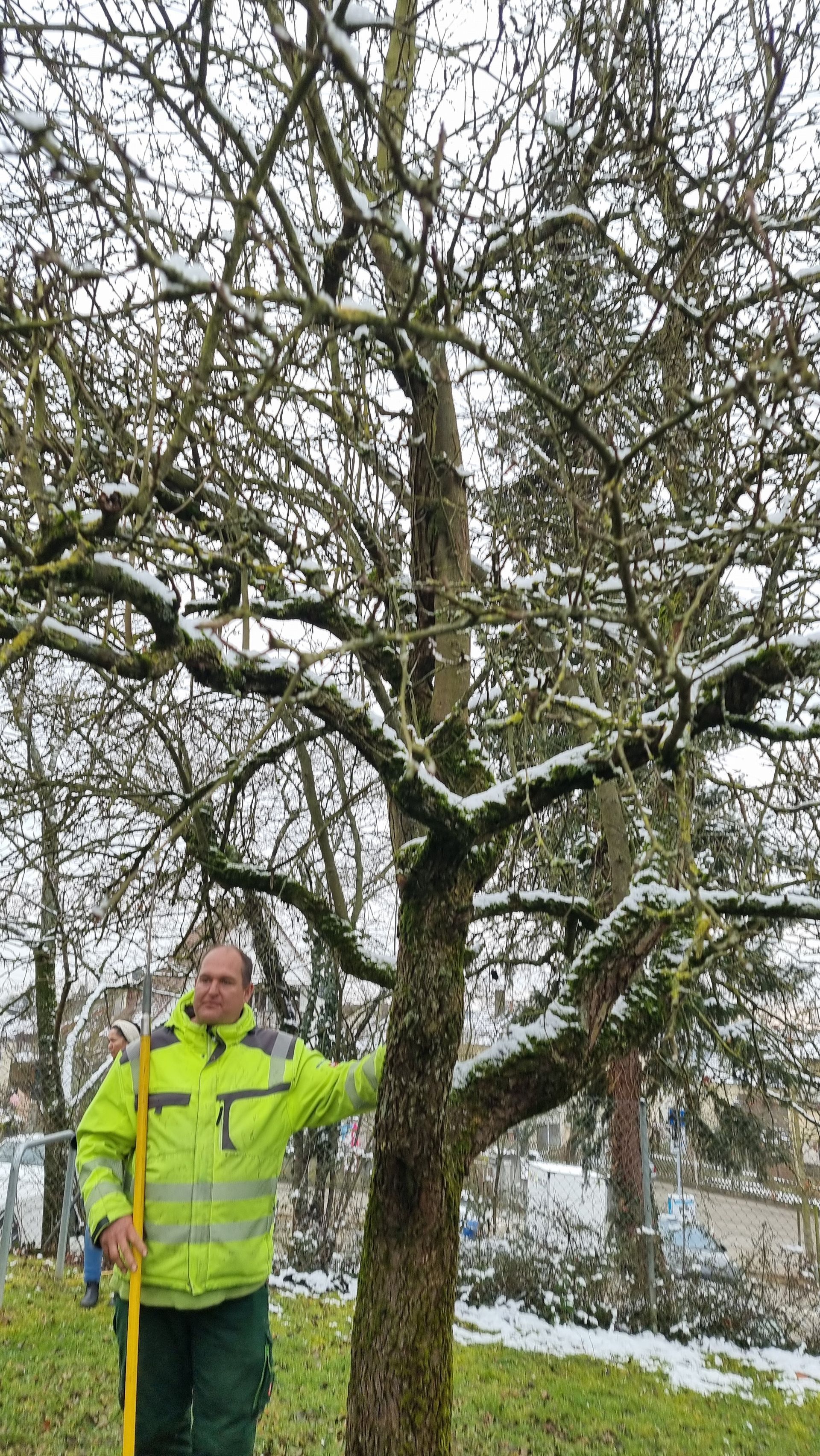 Als zweiten Baum nahm sich Herr Weißbarth dann einen im März 2024 gepflanzten Apfelbaum vor. Dieser Baum wurde vom Förderverein der Grundschule Hochberg für die Schüler der Grundschule gepflanzt.