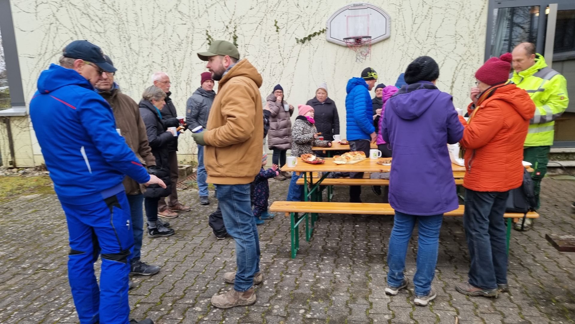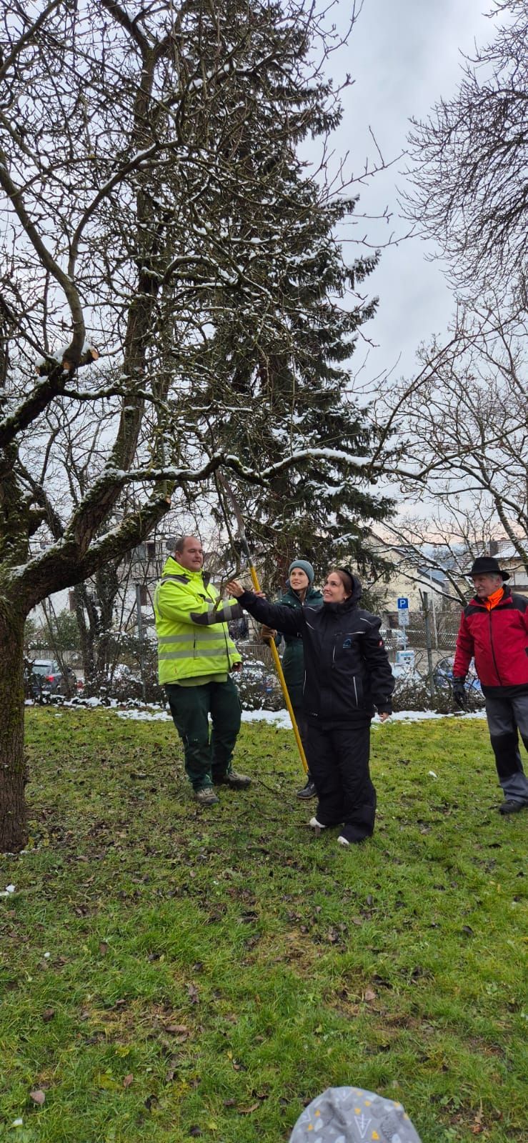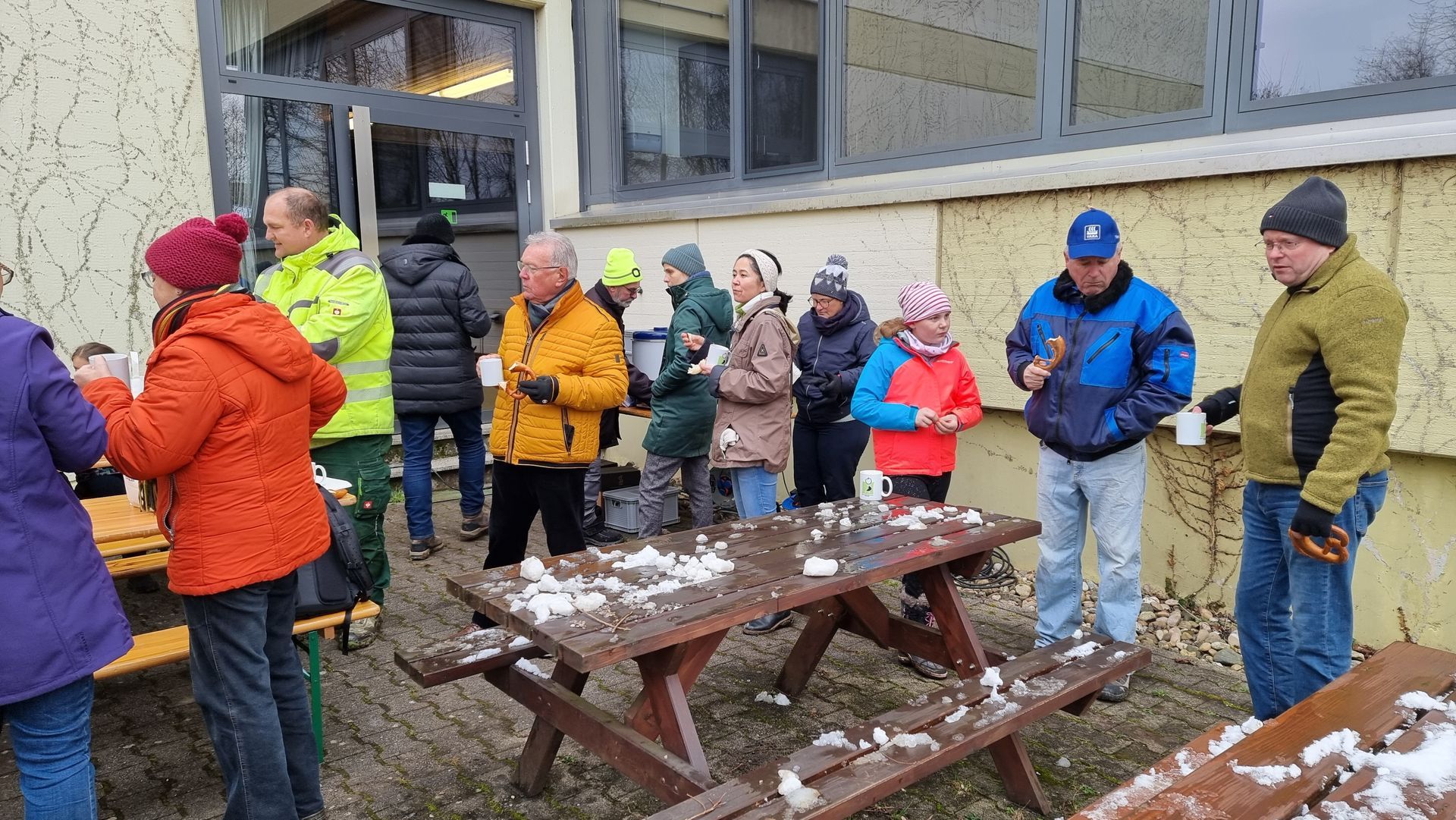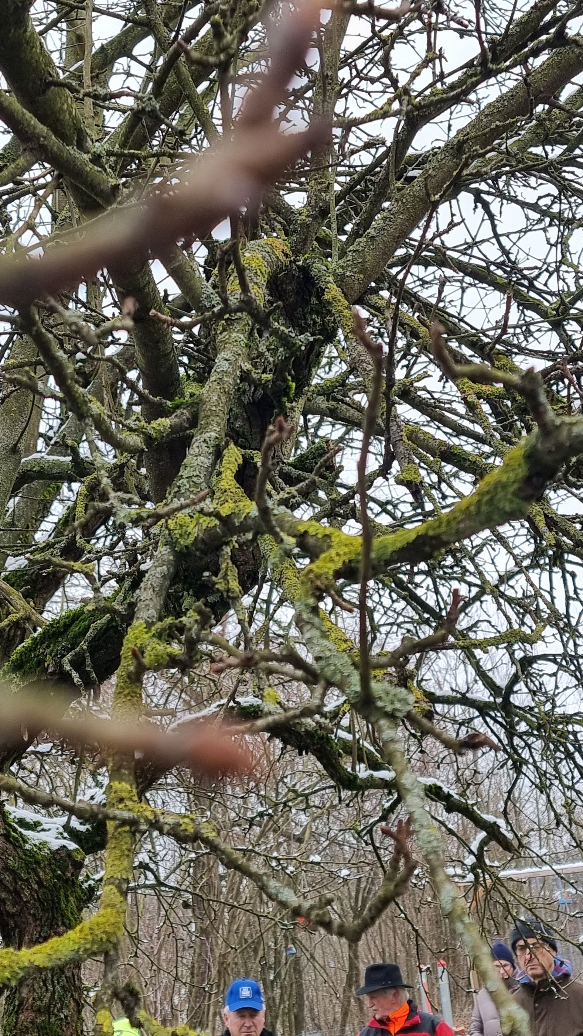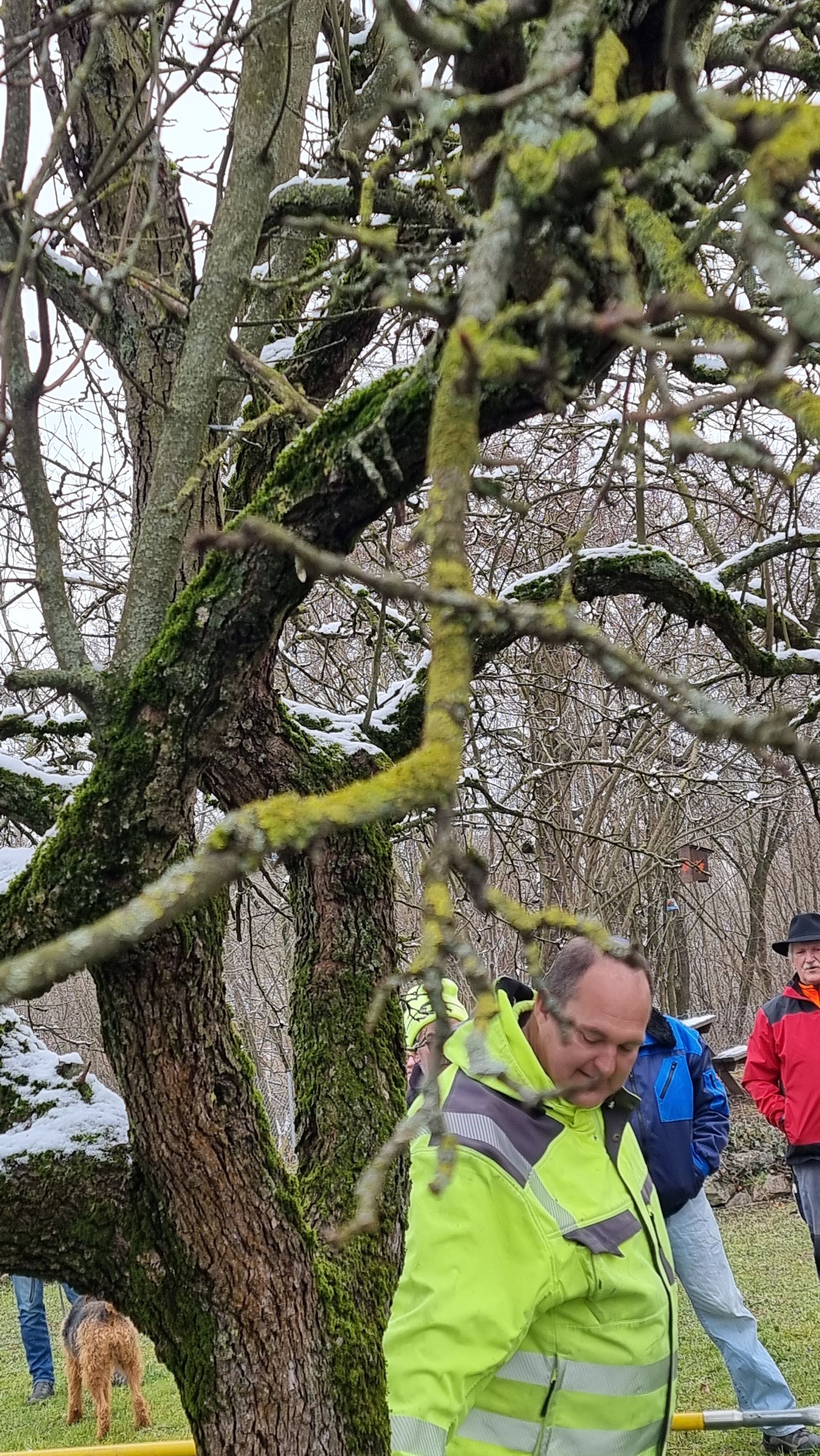 Danach merkten wir aber so langsam, aber sicher, dass es doch recht kalt war und alle freuten sich auf einen Becher Glühwein oder Punsch. Der Förderverein hatte diverse selbstgebackene Kuchen organisiert und wir kredenzten frische Brezeln. Und so konnte man dann noch in gemütlicher Runde lange über diverse Themen rund ums Bäumeschneiden fachsimpeln.