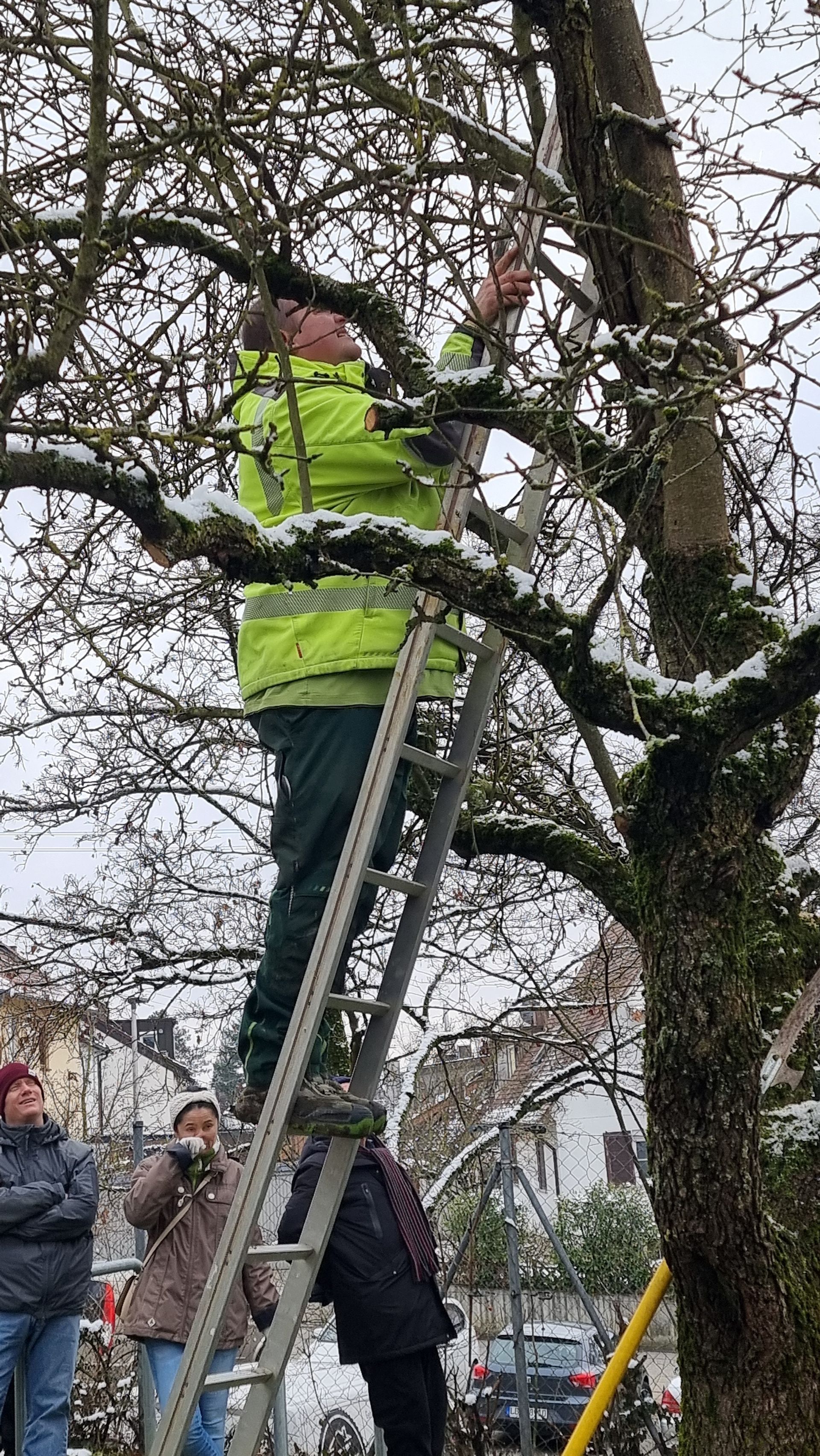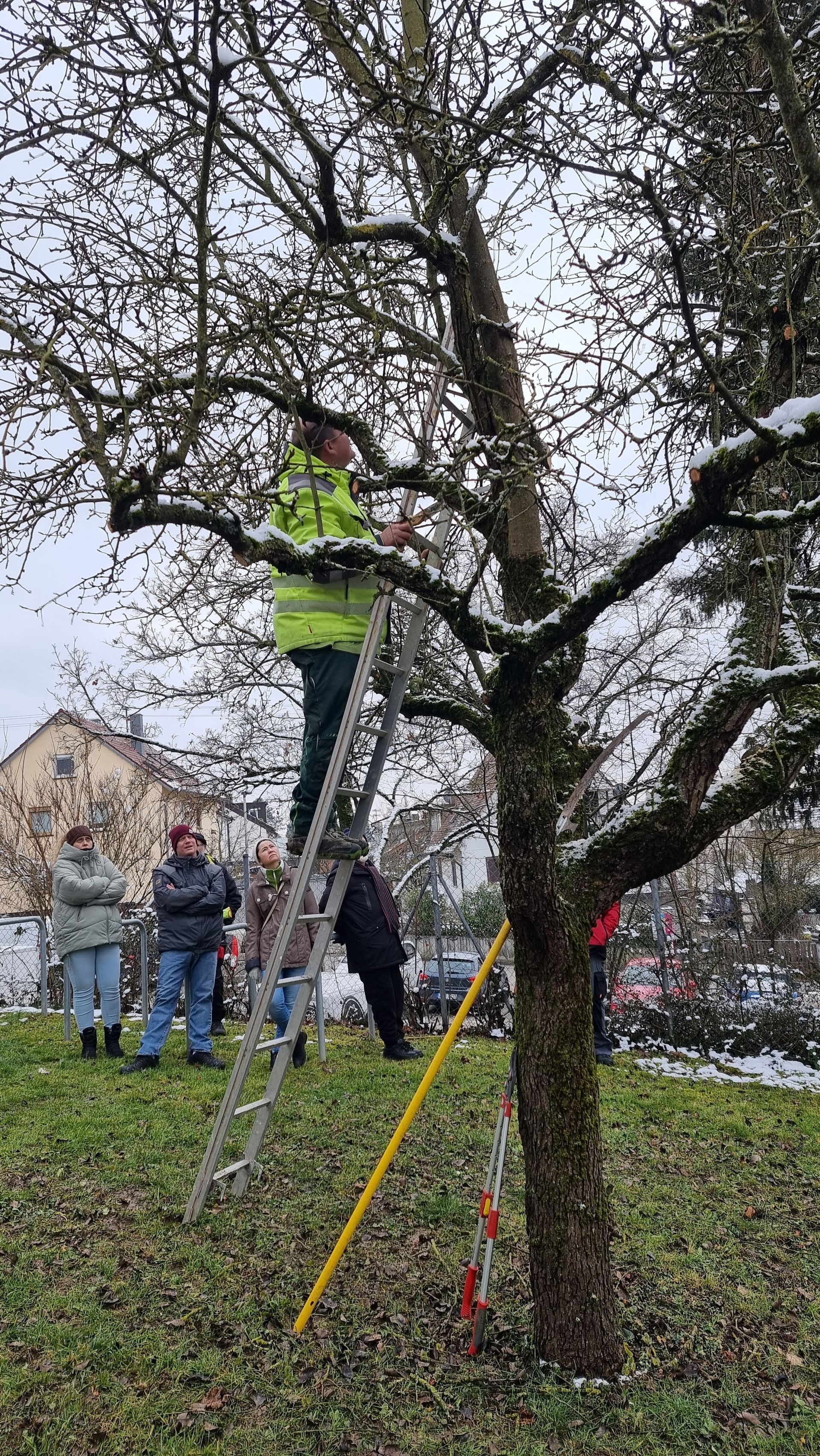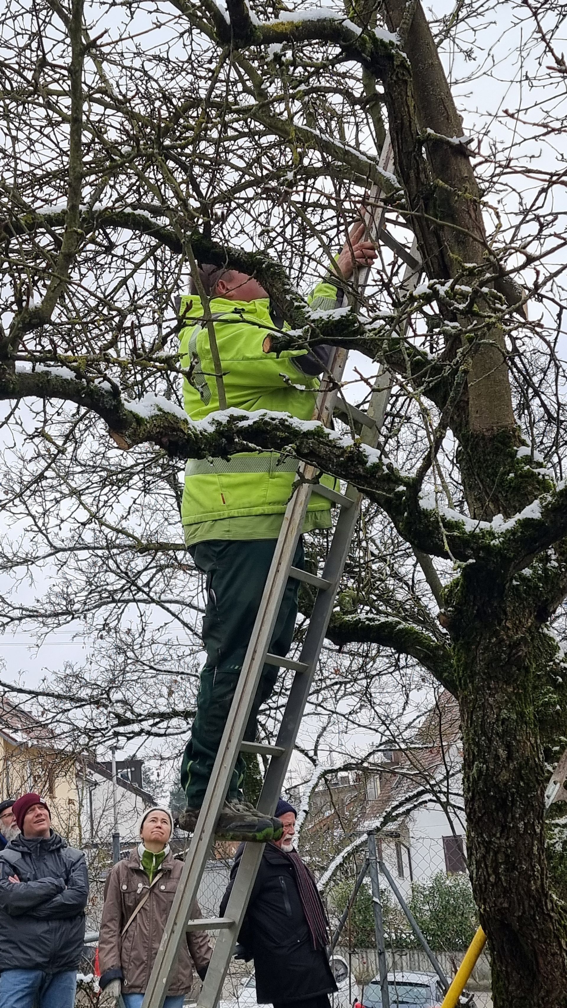 Hier hatten wir eine spezielle Situation. Wir hatten es mit einem sehr alten und seit vielen Jahren nicht mehr geschnittenen Birnenbaum zu tun. Entsprechend wild und hochgewachsen war der Baum. Herr Weißbarth erklärte ausführlich den Zustand des Baums und was man tun könne, um ihn wieder zu aktivieren. Allerdings ziehen sich dann diese Schnittmaßnahmen über mehrere Jahre hin, da man jetzt nur ca. 1/3 der Baummasse entfernen kann. Der Baum hatte auch bereits aus vielen Wasserschossen richtige Zweige und Stämme mit glatter Rinde gebildet, im Vergleich zu der normalen Rinde des Baums. Herr Weißbarth wies auch auf den Moosbefall und die Flechten hin. Beides sind jedoch keine Faktoren, die dem Baum grundlegend schädigen. Herr Weißbarth versuchte, dann Licht ins das Zweigengewirr zu bringen und schnitt auch alle Äste, die nach unten wuchsen, heraus. Die Äste sollten eine gewisse Steigung nach oben zeigen. Da der Baum so hoch war, benötigte er dann noch eine Leiter. Allerdings konnten die letzten 3 Astschnitte nicht durchgeführt werden, da hier noch anderes Werkzeug vonnöten war. Herr Münsch, der Vorsitzende des Fördervereins der Grundschule, wird sich aber darum kümmern.