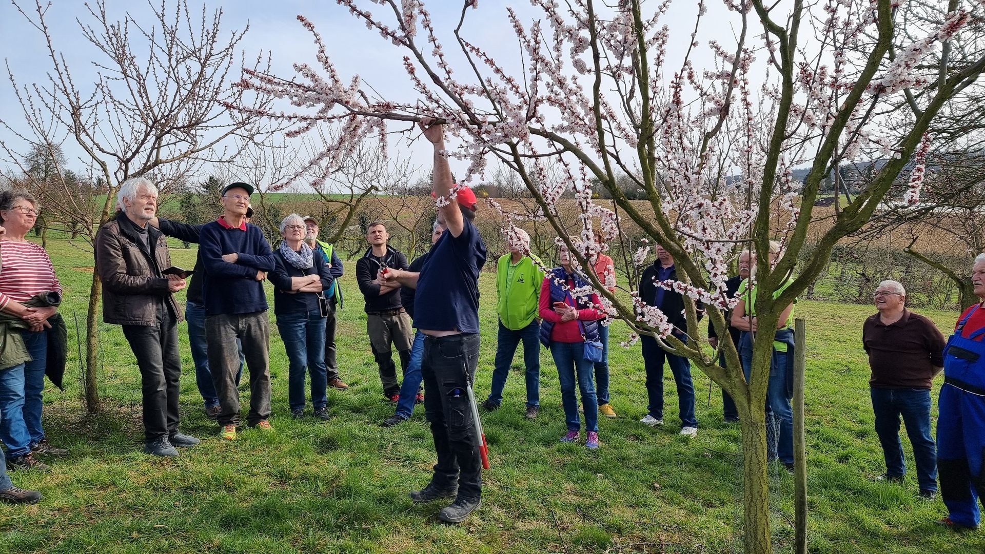 Bei frühlingshaftem, mildem Wetter fand sich eine sehr große Gruppe an Interessierten auf dem Grundstück unseres Vereinsmitglieds Uli Jäger in Hochberg ein, um Herrn Andreas Siegele bei seinen Ausführungen rund um Aprikosen- und Pfirsichbäume zuzuhören und natürlich, um ihn beim Schneiden zuzuschauen.